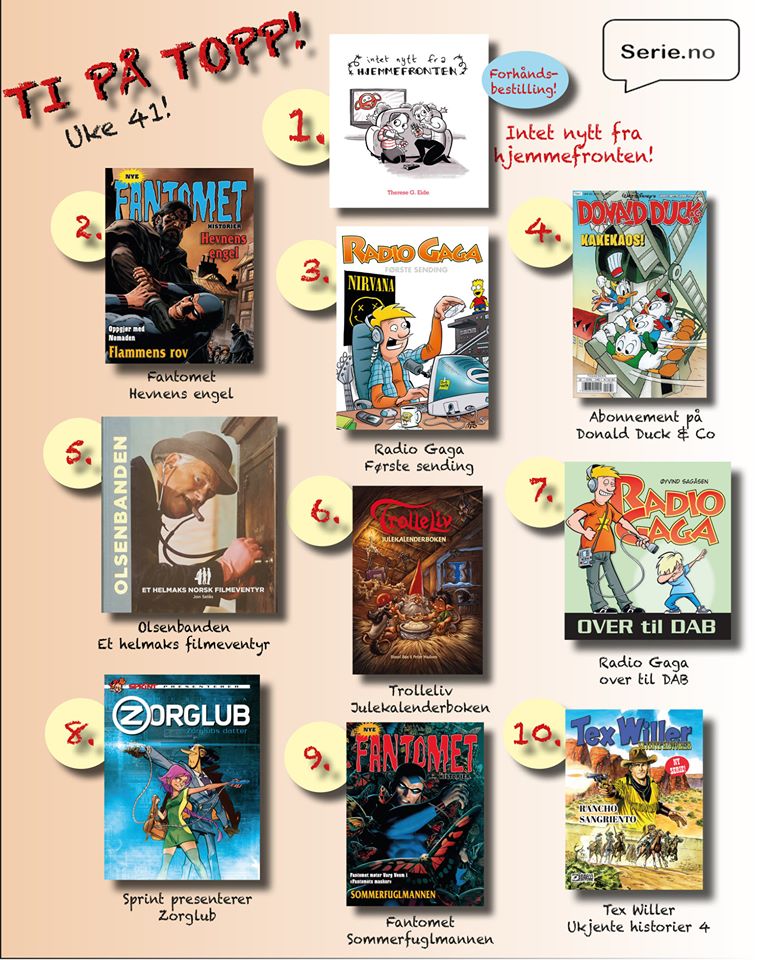 Posted by Egmont on Facebook, Fantomet present at number 2 and number 9 in top 10 sellers for week 41.