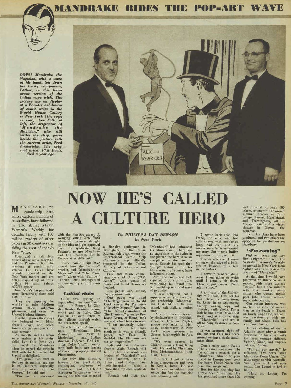 Printed in The Australian Women’s Weekly on the 17th of November 1965, titled Now He’s Called A Cultural Hero, we see Lee Falk being interviewed by Phillipa Day Benson.