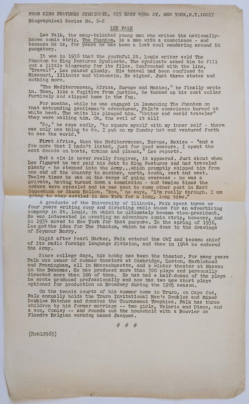Released in 1988 by King Features Syndicate via a Press Kit, below we see a page from the Press Kit detailing some further interesting information and exploits of Lee Falk (thank you Christopher Smith for sharing the below page).