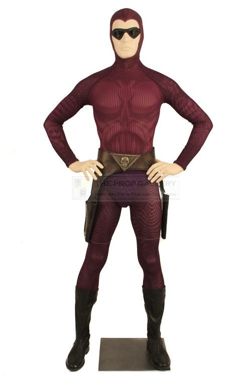 This is an original costume worn by Billy Zane as The Phantom and represents his signature wardrobe seen throughout the movie. The costume was fabricated for the production by Jim Henson Creature Shop and comprises of a purple cowl of neoprene stretch rubber featuring a suede lining to the interior to ensure it was comfortable for Zane to wear for long periods of time during filming and an eye mask of black plastic. The costume is expertly constructed in three pieces from a custom printed stretch fabric designed to cling to the body this with an extremely fine mesh like material over the top, accompanied by a large belt of black leather featuring side holsters with skull emblem and a metal buckle similarly adorned, a pair of original boots complete the costume.