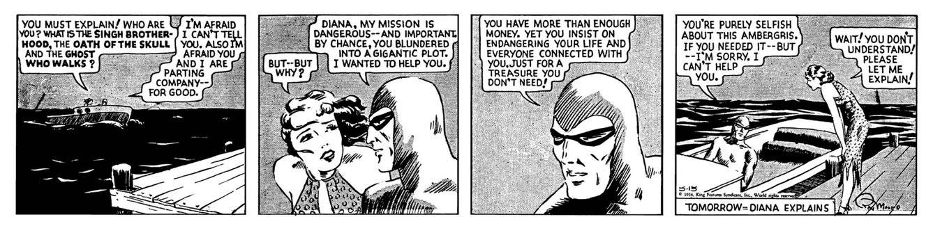The comic strip art is from the classic story titled ‘The Singh Brotherhood‘, written by Lee Falk and illustrated by Ray Moore, published on a daily basis in newspapers from the 17th of February 1936 thru till the 7th of November 1936. The panels contain images of the Phantom saving Diana from Achmed Singh, a member of the Singh Brotherhood.