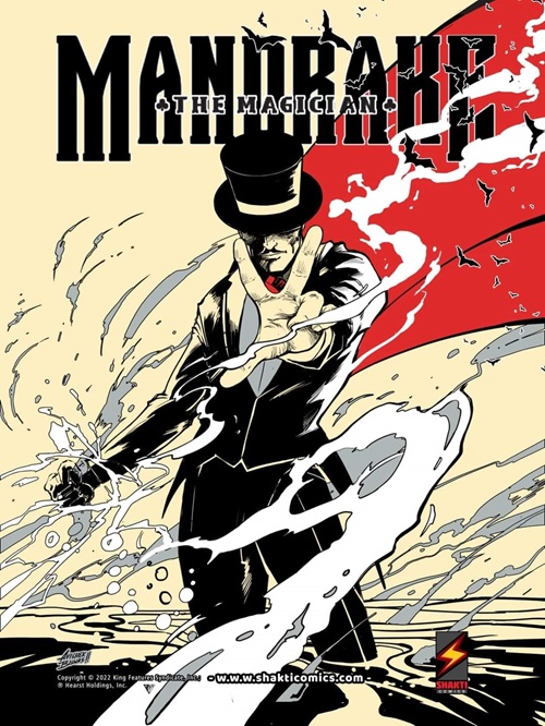 The poster features the Phantom riding Hero, with Guran and Devil by their side and Fraka gliding above. A Mandrake the Magician poster is also available. Both posters are provided by Shakti Comics in color printed on art paper and come folded.