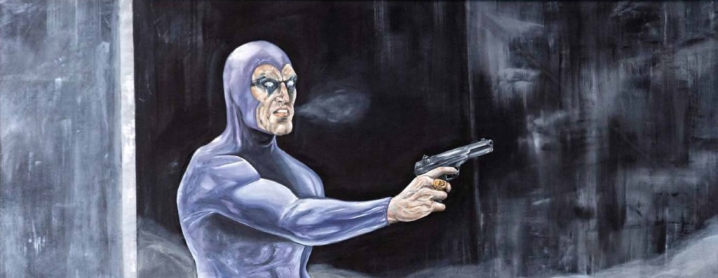 The first painting is titled ‘The Phantom‘, painted in 2023, oil on canvas and measures 230cm x 205cm. It features the Phantom with his gun drawn with Devil by his side.