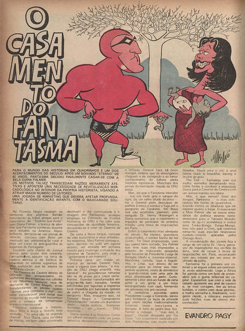 The Phantom appeared on the cover of Pasquim edition #454, published 10-16 March, 1978. The 32 page publication features art by Ziraldo on the cover, plus contains a full page article featuring the Phantom, with a second smaller article. See below the cover and 2 internal articles.