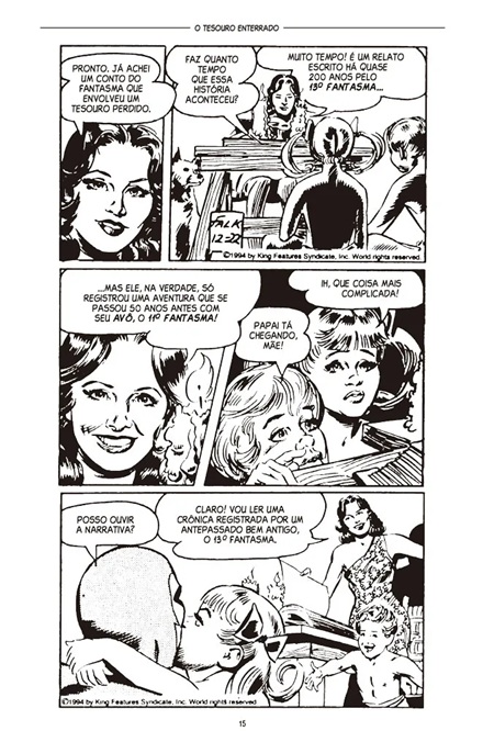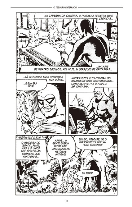 The pre-sale advertisement on the Mythos Editora website tells us that the stories found within the book are written by Phantom creator Lee Falk, and the comic strips are illustrated by George Olesen: