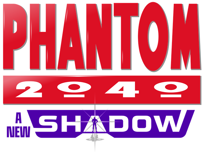 The final title design adopted displays a modern, multi-tiered title design as can be seen below. The words ‘PHANTOM 2040‘ dominate the top in large, bold, 3D-effect red lettering. The bottom section features a wide purple banner which holds the subtitle ‘A NEW SHADOW‘. An image of a person, likely a silhouette image of the Phantom is seen in the center omitting a bright, starburst-like light, adding a dynamic and futuristic sci-fi element to the overall presentation.