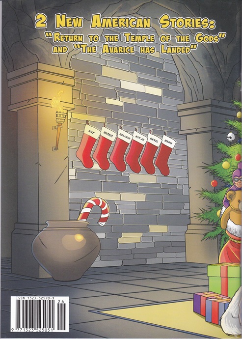 The back cover shifts focus to a quieter corner of the cave, where six red Christmas stockings hang against a grey stone wall, personalized for the entire family: Kit, Diana, Heloise, Kit Jr., Devil and Hero. A giant candy cane rests in a stone urn to the left. Highlighting the issue’s contents, the top of the page features bold yellow text announcing two new American stories: “Return to the Temple of the Gods” and “The Avarice Has Landed“.