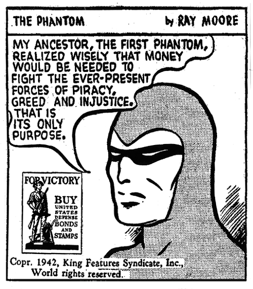As the world was thrust into World War II, the Phantom was more than just a comic strip. Lee Falk himself joined the Office of War Information, where he was chief of the radio foreign-language division. Meanwhile, Ray Moore also served in the war effort, and the strip was passed on to Wilson McCoy, who continued the strip throughout the war and afterward.