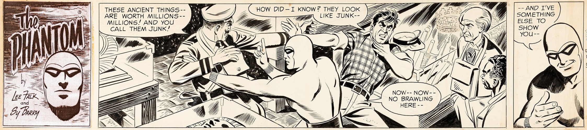 After the war, the Phantom continued to evolve through the contributions of different artists and writers. When Wilson McCoy passed away unexpectedly in 1961, a transitional period saw several artists fill in, including Carmine Infantino and Bill Lignante, until Sy Barry became the influential artist in the 1960s. Under Barry’s tenure, the strip gained a more modern look and increased international reach. Additionally, a generation of Phantom comic strip readers grew up solely seeing the art of Sy Barry in their daily newspapers.