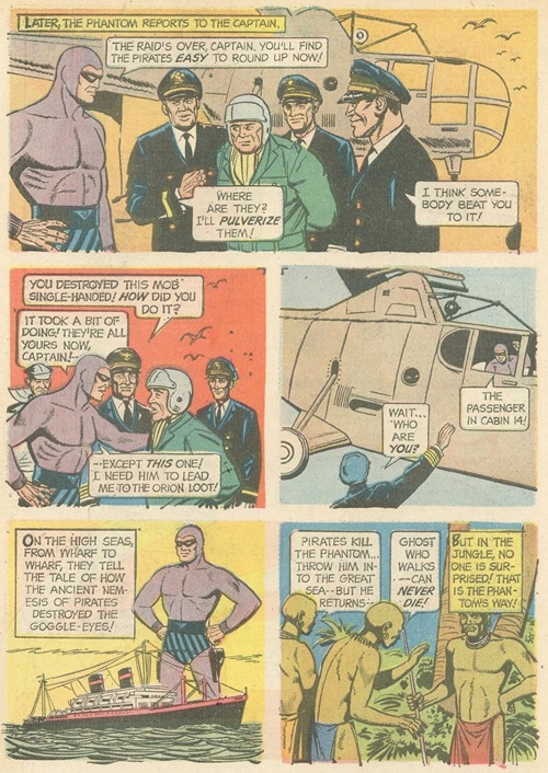 On this page, the Phantom delivers a group of captured pirates to the authorities after successfully thwarting their raid. The Phantom single-handedly hands over the mob to a sea captain but retains one prisoner in a flight helmet, whom he intends to use to locate the “Orion Loot“. As the Phantom departs in a small aircraft, leaving the captain questioning his identity, the final panels shift to a legendary summary of his reputation. These panels reinforce the Phantom’s mythos as the “ancient nemesis of pirates” and “The Ghost Who Walks“, illustrating how his feats against villains like “The Goggle-Eye Pirates” are whispered about both on the high seas and deep within the jungle, where his seemingly immortal nature is accepted.