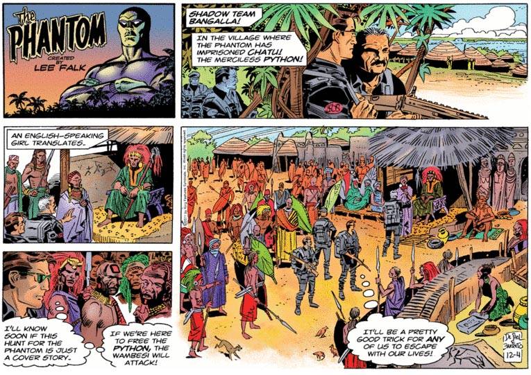 Eduardo’s years of experience shine through again in this Sunday Phantom comic strip. We see amazing details in not only his background scenes but also in the way he depicts wildlife, tribesman and uniformed soldiers. His perception to understand shadows is evident, especially in the scene where the Wambesi chieftain is being addressed in his village by the unwelcome soldiers, as can be seen below.