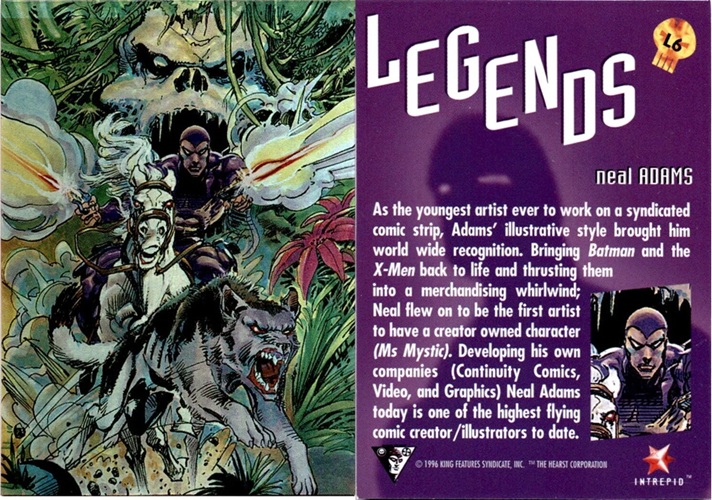 In 1996, Neal Adams was commissioned by Intrepid to produce a piece of art featuring the Phantom, which was incorporated into The Phantom Gallery trading card set released in Australia as part of the Legends special insert cards, numbered L6. This trading card, characterized by a highly reflective foil finish, is double-sided; the front displays the Phantom racing from the Skull Cave on Hero with Devil leading the charge, while the reverse contains a brief biography of Neil Adams. The front and back of the trading card can be seen below.