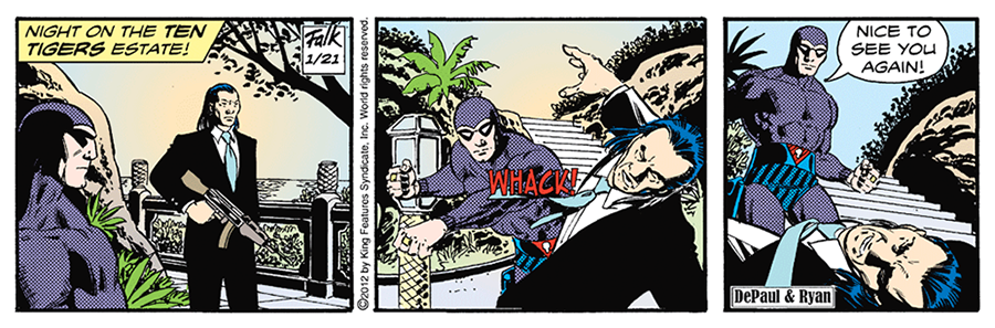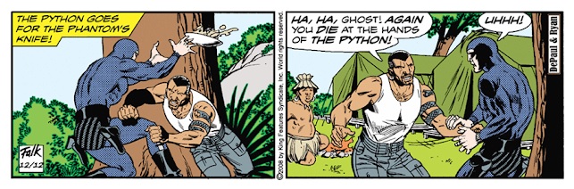 In 2004, the Phantom celebrates his 80th Anniversary and George Olesen finishes his work as an artist on the Phantom. Inked by Keith Williams on the daily strips and Fred Fredericks on the Sunday pages, Sy Barry’s former assistant has given rise to a transition phase (with more shadows than light) marked in 1999 by the death of Lee Falk, who is permanently replaced by Tony DePaul after a short period of alternation with Claes Reimerthi.