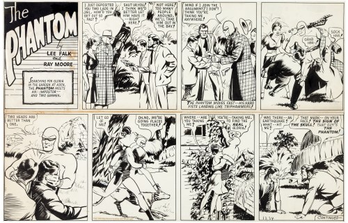Raymond S. Moore was born in Oklahoma, but lived in Missouri for most of his life. The son of a jeweler, he attended the Saint-Louis University and started out doing commercial work. He entered the field of comics through Phil Davis, whom he assisted on ‘Mandrake the Magician’. Moore is best known as the original artist of ‘The Phantom’, together with writer Lee Falk. The series began with a daily newspaper strip on 17 February 1936, followed by a color Sunday strip on 28 May 1939; both are still running as of 2017.