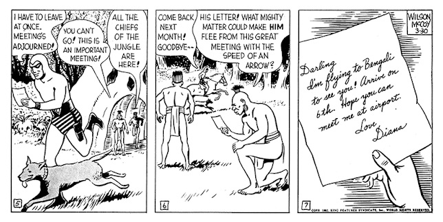 After seven years of work as a ghost artist, McCoy’s first officially credited story, “Queen Asta of Trondelay”, was published between July 15 and October 26, 1946. Three years later, with the publication of “Fathers and Sons” (20 February – 24 April 1949), the artist also begins to sign the Sunday plates. Although Moore’s shadow does not disappear immediately, Wilson tries to completely detach himself from the design of his predecessor, developing a flat and essential style, deliberately naive, so naive as to seem childish. A clean break with the past of which there were already signs in the period spent as an assistant, during which his hand had taken more and more space contributing to the stylistic transformation of Moore. McCoy takes care of the smallest detail and makes extensive use of photographic documentation in search of maximum naturalness, setting up home sets in which his wife and children pose for him interpreting the scenes to be drawn. The villa where she lives and works, located in Barrington at 254 Donlea Road (in the Chicago metropolitan area), becomes the model for Diana Palmer’s house, demonstrating how the real context is the essential basis of her work. In short, McCoy’s style is not as childish as it might seem: Wilson re-elaborates reality through an extraordinary work of synthesis, demonstrating remarkable technical skills and a personality capable of flowing into an irresistible pop vein.