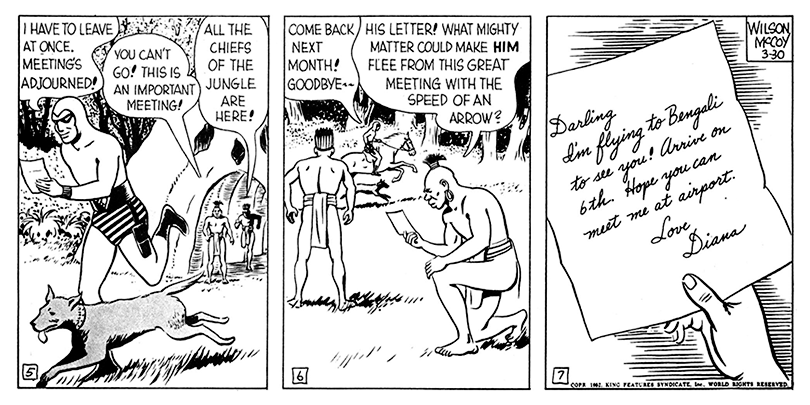 After seven years of work as a ghost artist, McCoy’s first officially credited story, “Queen Asta of Trondelay”, was published between July 15 and October 26, 1946. Three years later, with the publication of “Fathers and Sons” (20 February – 24 April 1949), the artist also begins to sign the Sunday plates. Although Moore’s shadow does not disappear immediately, Wilson tries to completely detach himself from the design of his predecessor, developing a flat and essential style, deliberately naive, so naive as to seem childish. A clean break with the past of which there were already signs in the period spent as an assistant, during which his hand had taken more and more space contributing to the stylistic transformation of Moore. McCoy takes care of the smallest detail and makes extensive use of photographic documentation in search of maximum naturalness, setting up home sets in which his wife and children pose for him interpreting the scenes to be drawn. The villa where she lives and works, located in Barrington at 254 Donlea Road (in the Chicago metropolitan area), becomes the model for Diana Palmer’s house, demonstrating how the real context is the essential basis of her work. In short, McCoy’s style is not as childish as it might seem: Wilson re-elaborates reality through an extraordinary work of synthesis, demonstrating remarkable technical skills and a personality capable of flowing into an irresistible pop vein.