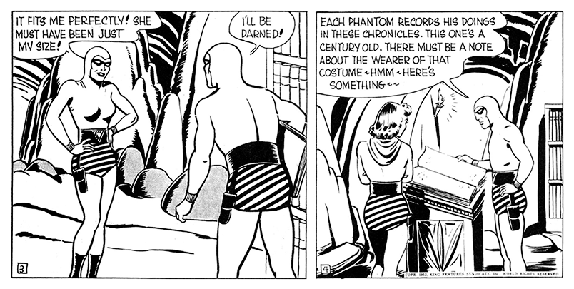 McCoy also transfers his experience as a pin-up illustrator into the drawing of the female figure: starting with Diana, his women are pretty bourgeois-looking girls, far removed from the sensual femmes fatales and sophisticated Hollywood stars outlined by his predecessor. The Phantom also radically changes its appearance, going from Moore’s athletic and powerful figure to a buttery physique that makes the tights look like a clunky pajama.
