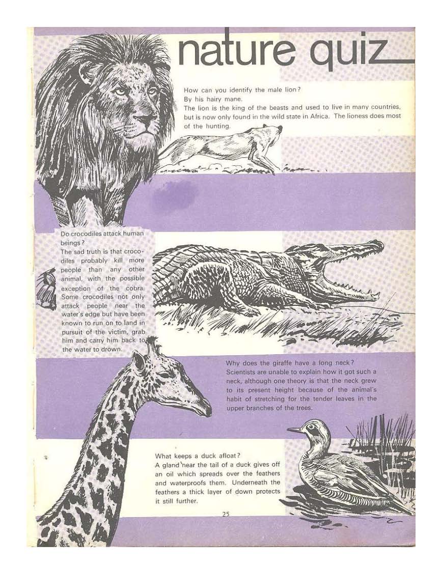 These books featured a variety of content, including general knowledge articles, comic book stories, comic strips and a variety of activity pages ranging from crossword puzzles to animal quizzes.