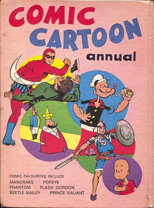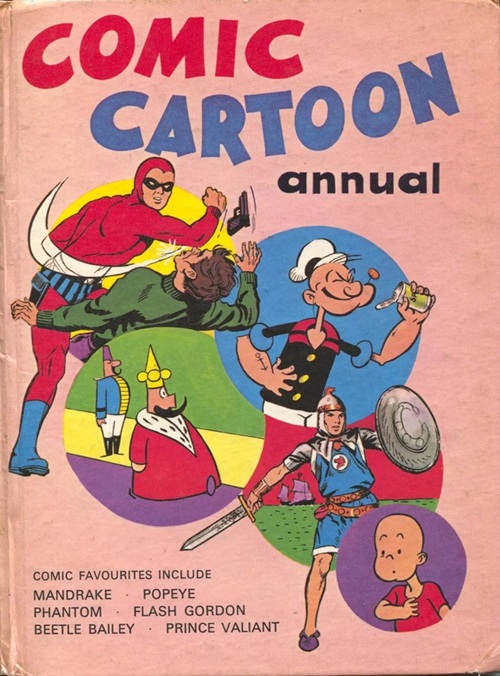 Comic Cartoon Annual was published by Purnell and Sons Ltd in the United Kingdom in 1967. The hard book contains a variety of comic strips, with characters featured including the Phantom, Flash Gordon, Prince Valiant, Popeye, Secret Agent X-9, Mandrake the Magician, Little King, Henry and Beetle Bailey. The book is licensed by King Features Syndicate.