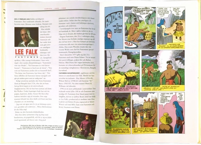 The page within the book to feature the Phantom creator Lee Falk can be seen below. On the opposite page, a Fantomen comic strip is published, illustrated by Wilson McCoy.