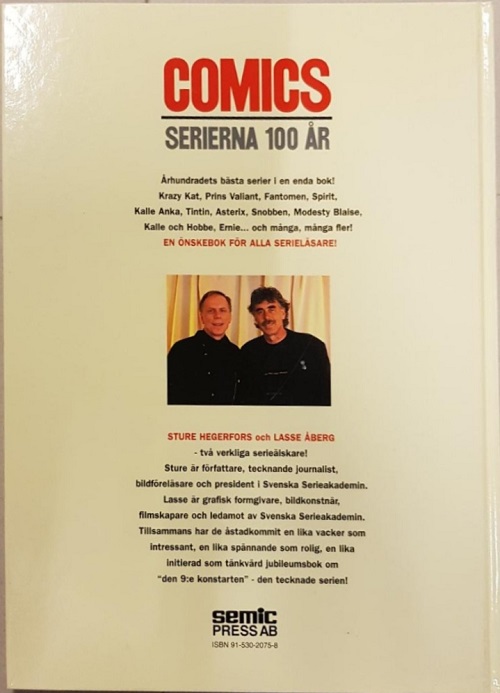 Comics – Serierna 100 År (which translates to Comics – The Series 100 Years) is a book published by Semic Press AB in Sweden in 1996. The book is by Swedish co-authors Sture Hegerfors (writer, journalist and illustrator) and Lasse Åberg (graphic designer, filmmaker and visual artist).