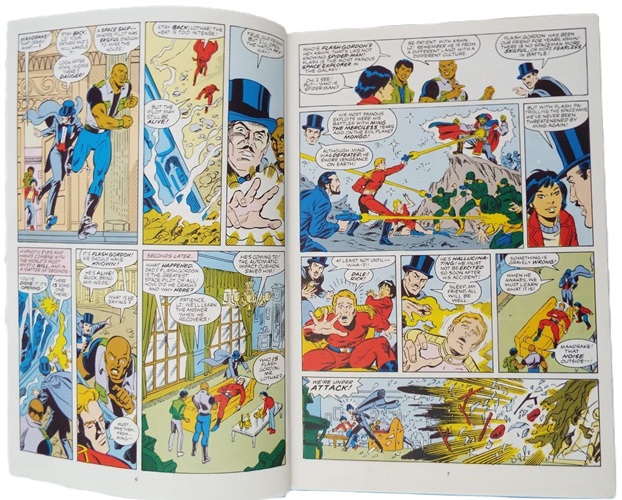 The Defenders of the Earth Annual book was printed in Italy and sold exclusively within the United Kingdom. It contains 64 full color pages measuring 28.5cm x 19.5cm. The same image is found on the front and back covers, an illustration by Alex Saviuk and Fred Fredericks featuring the Defenders of the Earth characters, which include the Phantom, Flash Gordon, Mandrake the Magician, Lothar, Ming the Merciless and more.