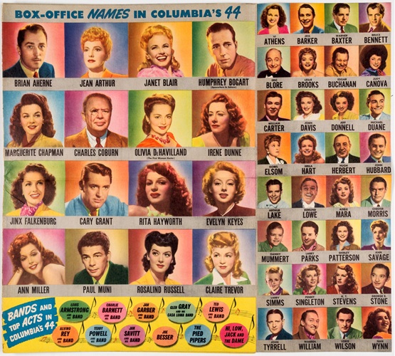 Page three showcases 16 prominent stars in color photographs, including Rita Hayworth, Humphrey Bogart, Cary Grant, Claire Trevor, Paul Muni, Irene Dunne, among others. Additionally, there is a side page dedicated to color images of a subsequent tier of stars, featuring Ann Savage, Adele Mara, Judy Canova, Joan Davis, Jess Barker, Bruce Bennett, Penny Singleton, and others.