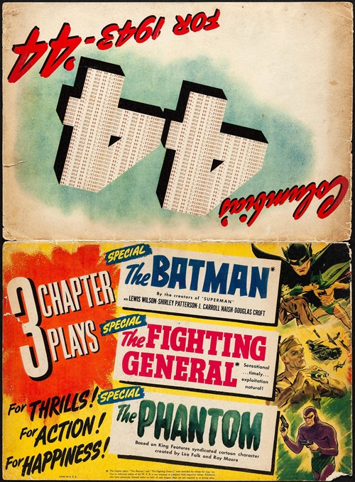 Included also is a page on Charles Starrett and Russell Hayden westerns, and the inside back cover has a full color art rendering of ‘The Three Stooges’ announcing them in 8 upcoming films for the 1943-1944 season. The top part of the front cover when unfolded contains a mix of serials including Batman, The Fighting General and the Phantom, as can be seen below.