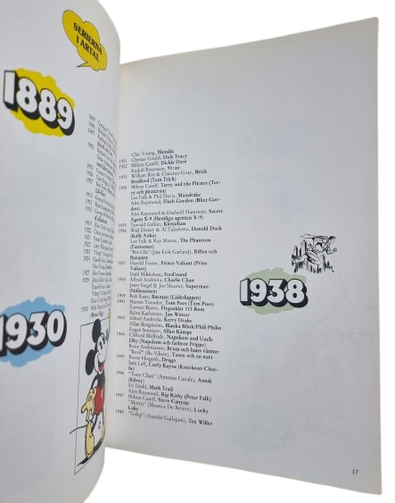Found within the book are a large select of comic book characters and their creators including Adamson, Alfredo, Allan Kämpe, Asterix, Teddy, Barbarella – The Scandalous Space Girl, Biffen and Banana, Blondie Buck Rogers, Brick Bradford, Flash Gordon, Buster Brown, Dick Tracy, Felix the Cat, Ferd´nand, Fridolf Celinder, Fritz The Cat, Gaston, Gyllenbom, Kalle Anka, Karl-alfred Kerry Drake, Kilroy, Knoll and Tot, Krazy Kat, Kronblom, Lisa and Sluggo, Lucky Luke, The Leather Patch, Mad, Mandrake the Magician, Modesty Blaise, Micuse Pigg, The Mysterious 2, 91, Number 13 Wilmer (Knasen), Prince Valiant, Rip Kirby, The Snob, Spiderman, Superman, Iron Man, Tarzan, Tintin, The Wizard From Id and Tuffe Viktor.