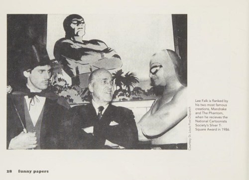 We also find a page featuring a photo of Lee Falk surrounded by the Phantom and Mandrake the Magician as costumed characters, taken in 1986 upon winning the National Cartoonists Society’s Silver T-Square Award.
