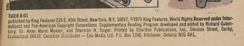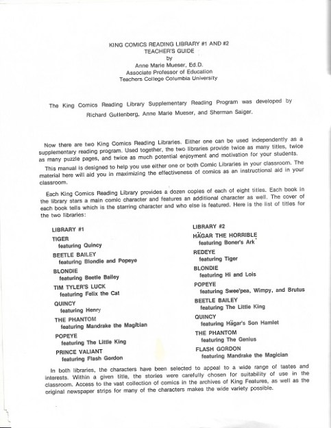 The King Comics Reading Library Supplementary Reading Program was developed by Richard Guttenberg, Anne Marie Mueser and Sherman Saiger for King Features Syndicate in USA in 1977. The program was established as an aid for Teachers to educate young children, specifically in areas of reading such as vocabulary and sentence construction.