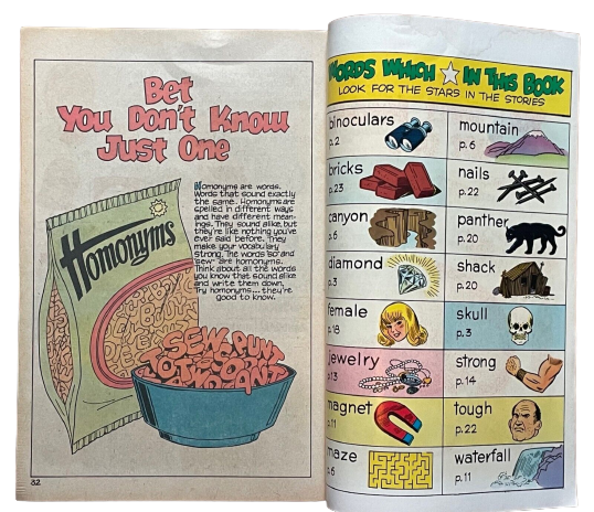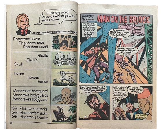 Incorporated within each issue of the 16 comic series published in 1977, were engaging educational puzzles and quizzes and a pictorial dictionary that centered on the story inside as well as the diverse cast of King Features characters showcased within that specific issue. The inside back cover of each issue contains the answers to these puzzles and quizzes. A sample of these can be seen below, found in edition number R-06 in ‘Library #1’ featuring the Phantom, with the puzzle page seen on the left and the answer page seen on the right.