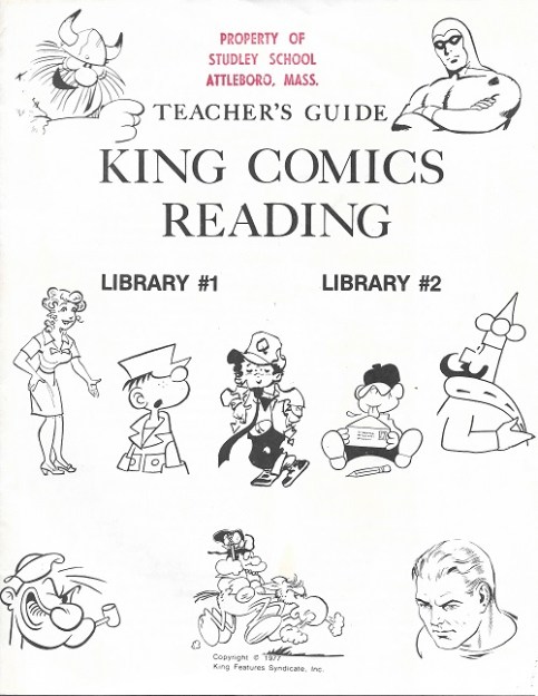 King Features Syndicate sent a ‘Teacher’s Guide – King Comics Reading’ manual to select schools in the Midwest of United States in 1977. The manual measures 8.5″ x 11″ and contains 32 black and white pages, explaining to Teacher’s how comic books should be used within the classroom to educate children. The front cover of this manual can be seen below.