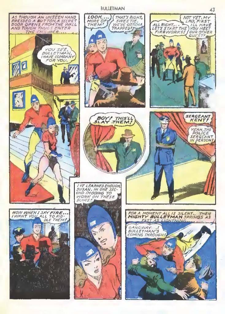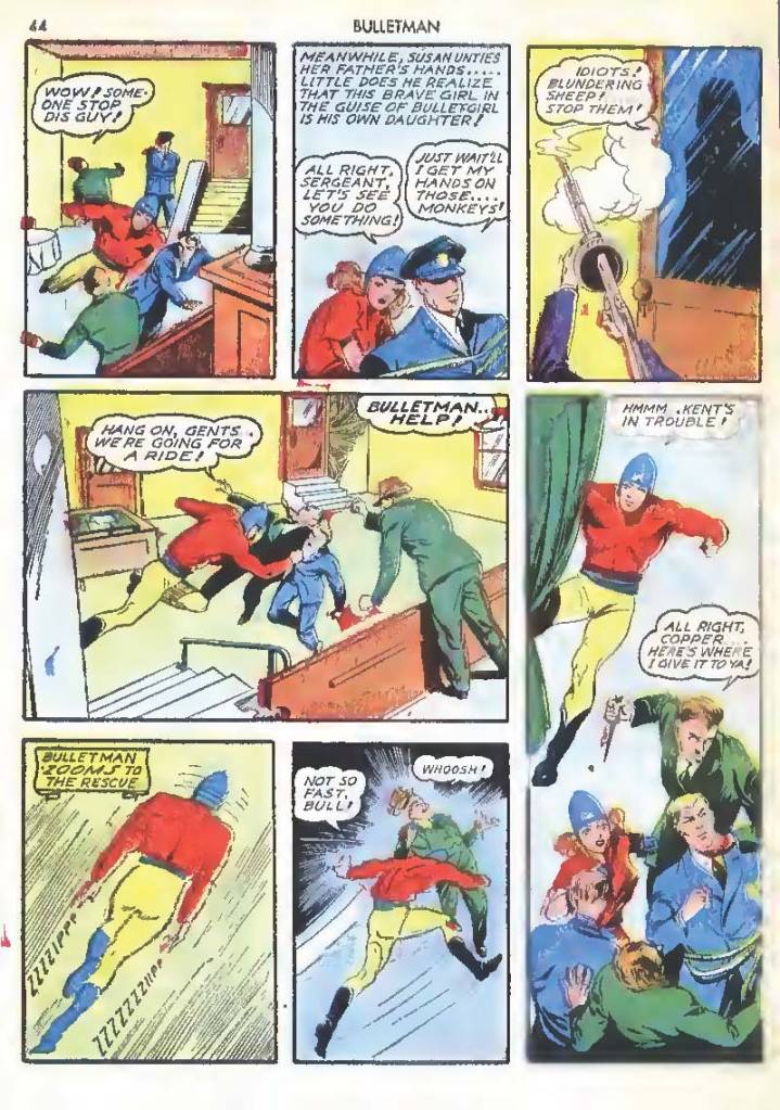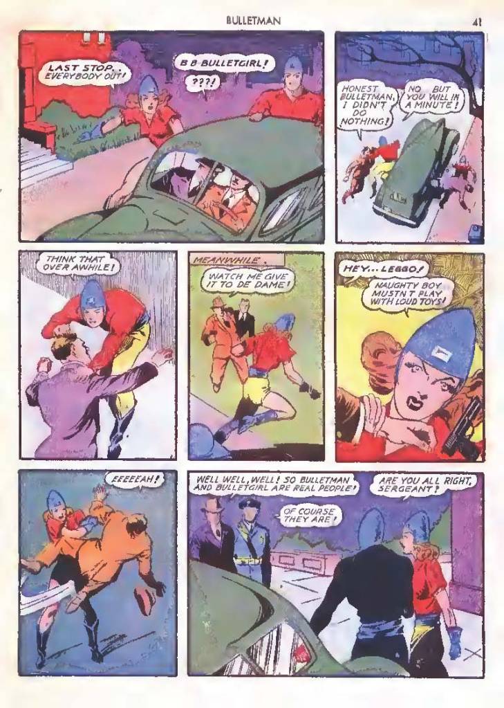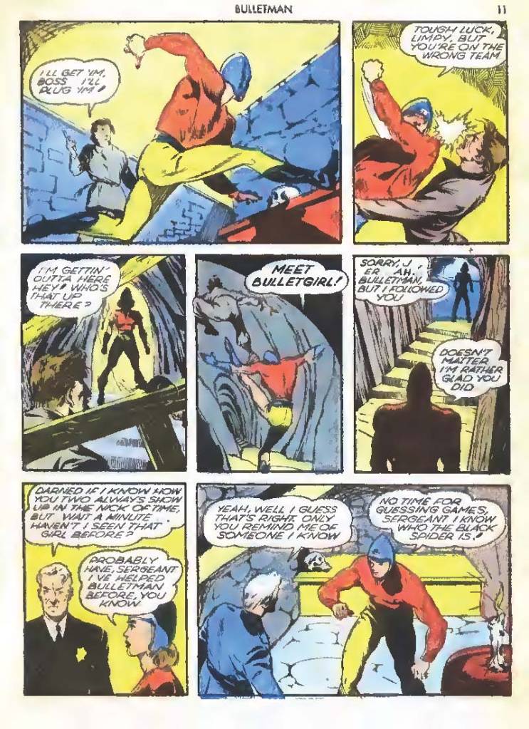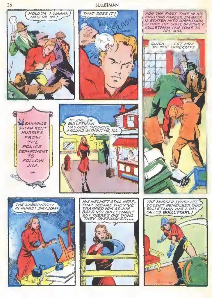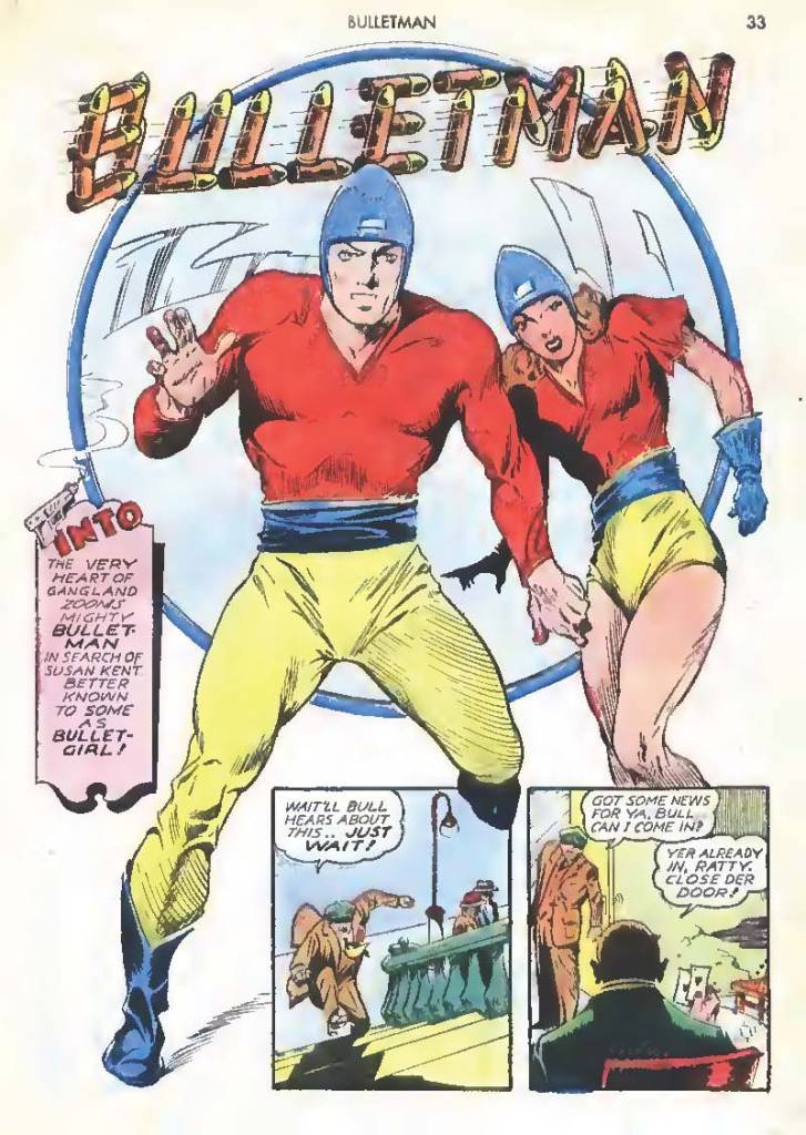Shortly after Bulletman began his crime-fighting career, he created a second helmet for his girlfriend and later wife Susan Kent, daughter of Police Sergeant Kent who adopted the name Bulletgirl. His formula was shown to make him strong enough to smash a tank.
