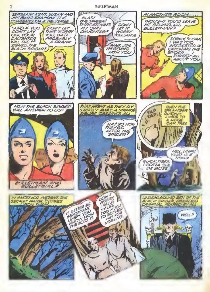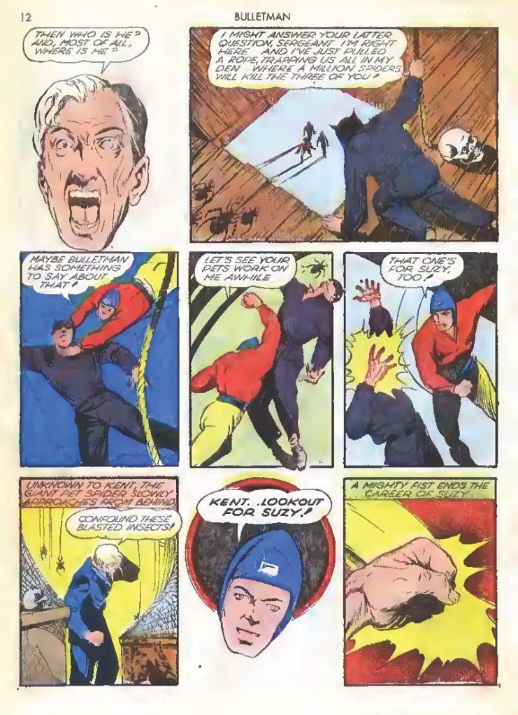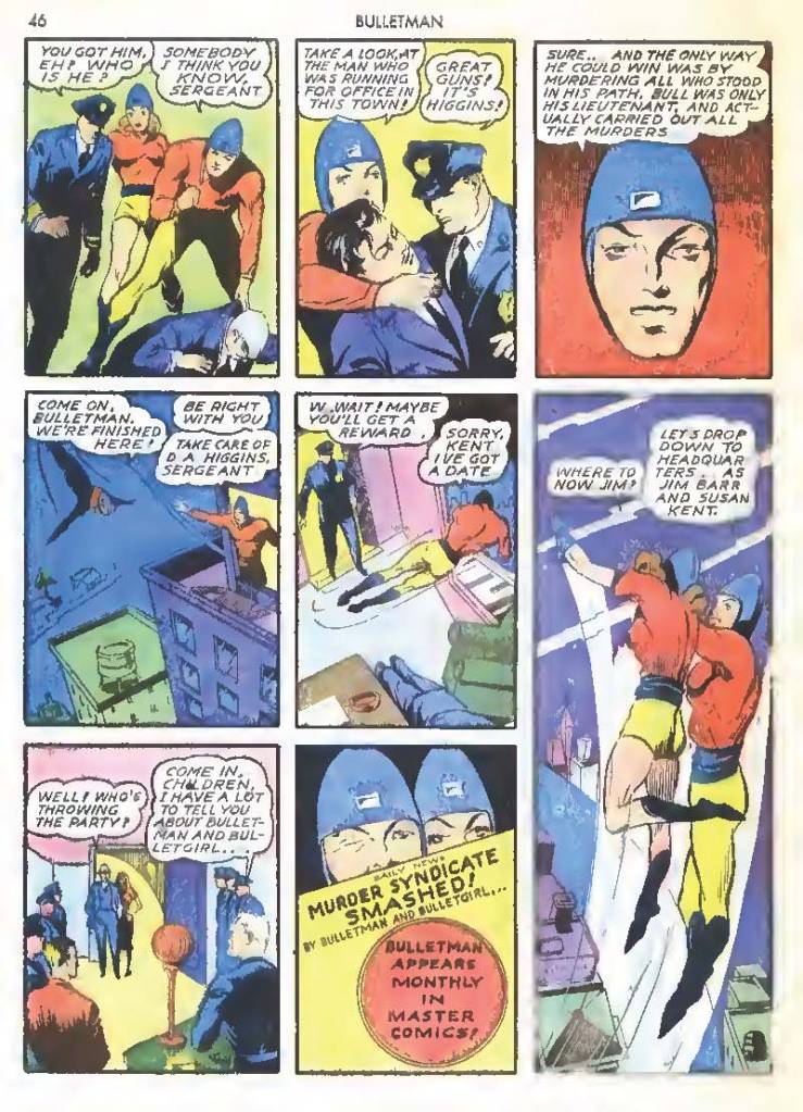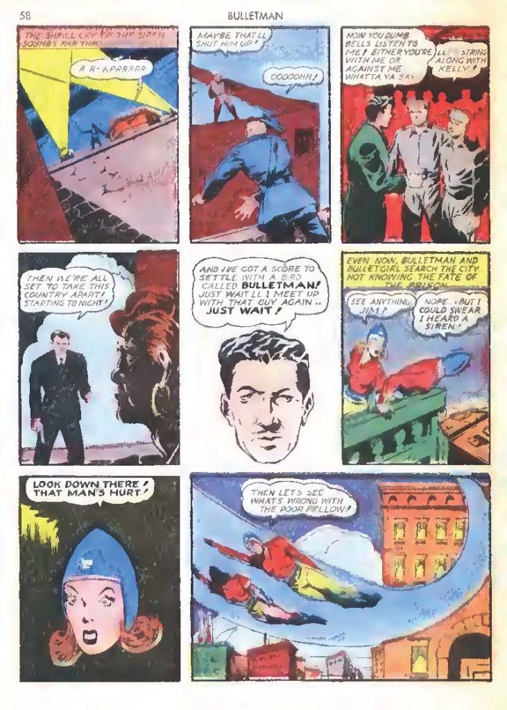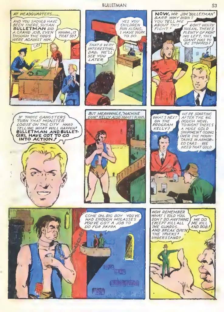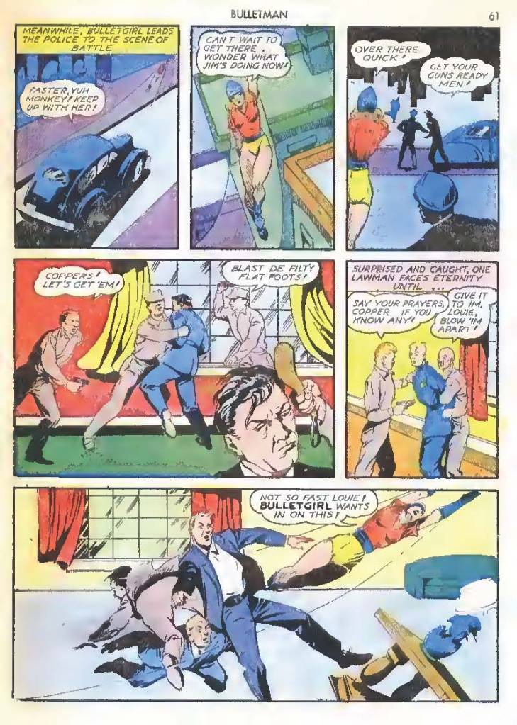 Shortly after Bulletman began his crime-fighting career, he created a second helmet for his girlfriend and later wife Susan Kent, daughter of Police Sergeant Kent who adopted the name Bulletgirl. His formula was shown to make him strong enough to smash a tank.