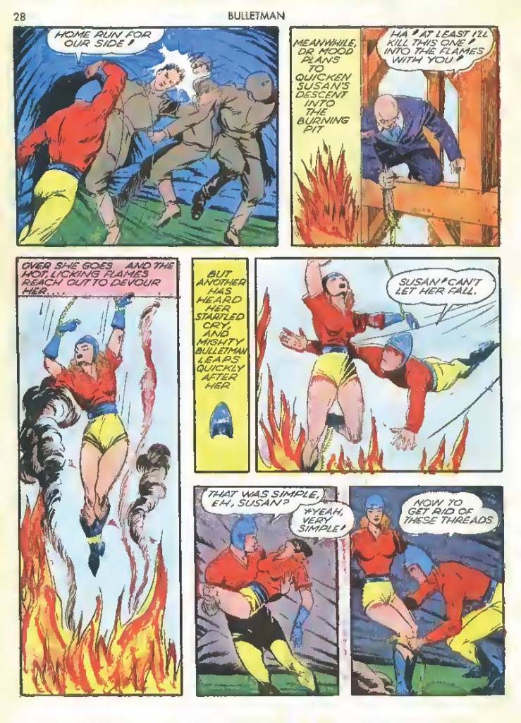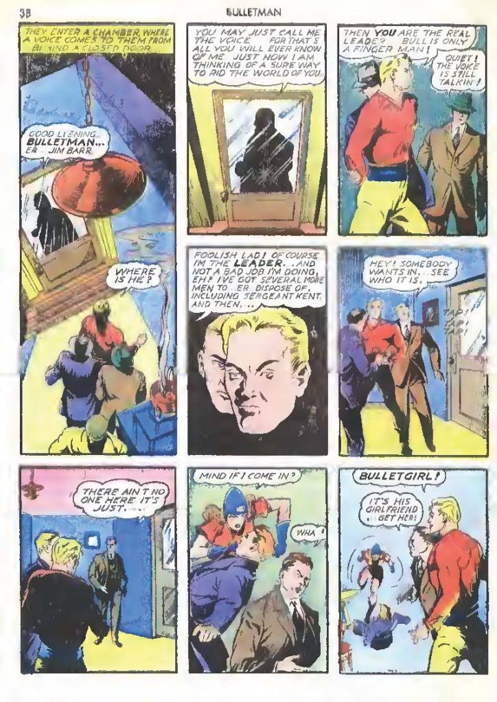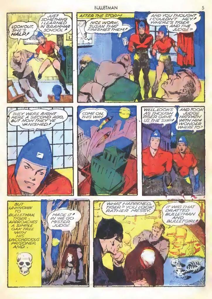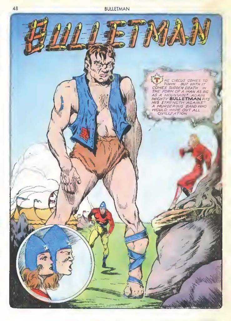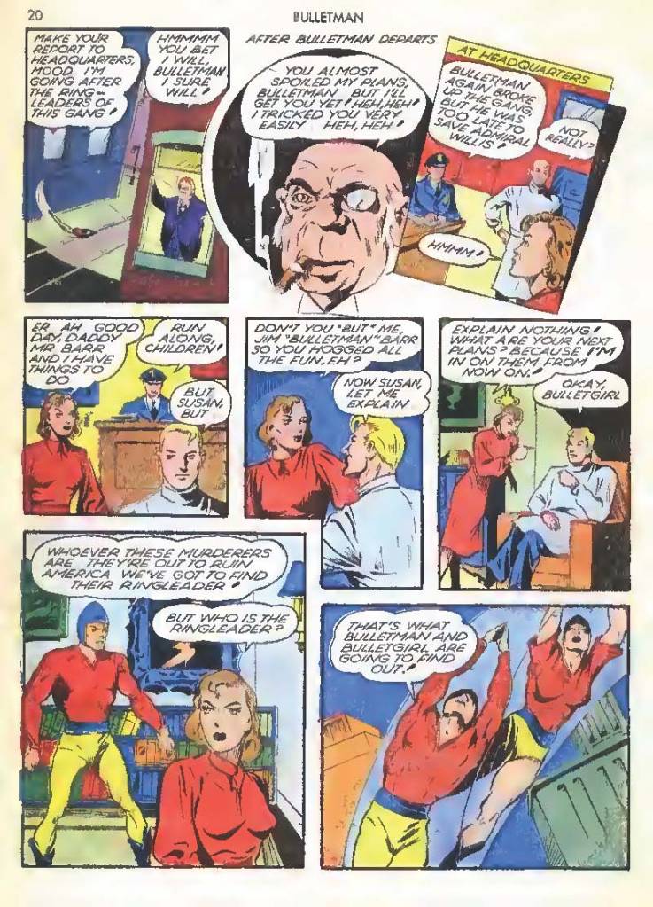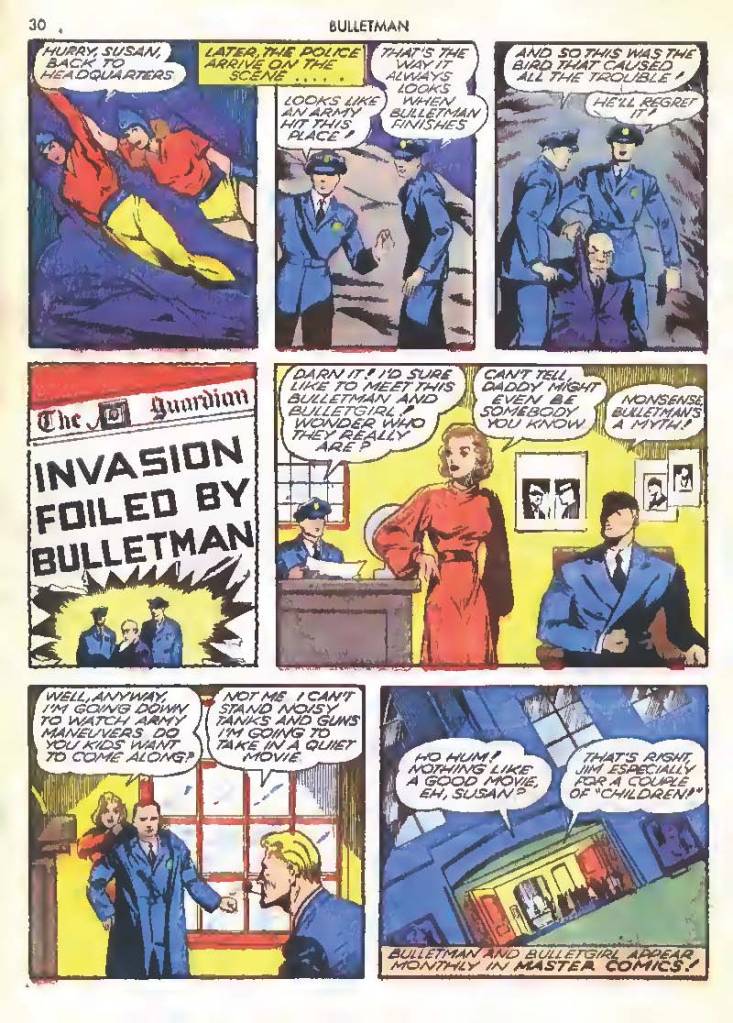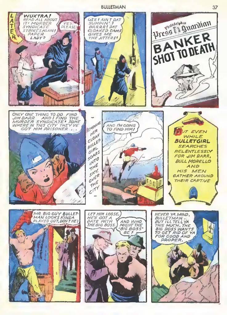 Shortly after Bulletman began his crime-fighting career, he created a second helmet for his girlfriend and later wife Susan Kent, daughter of Police Sergeant Kent who adopted the name Bulletgirl. His formula was shown to make him strong enough to smash a tank.
