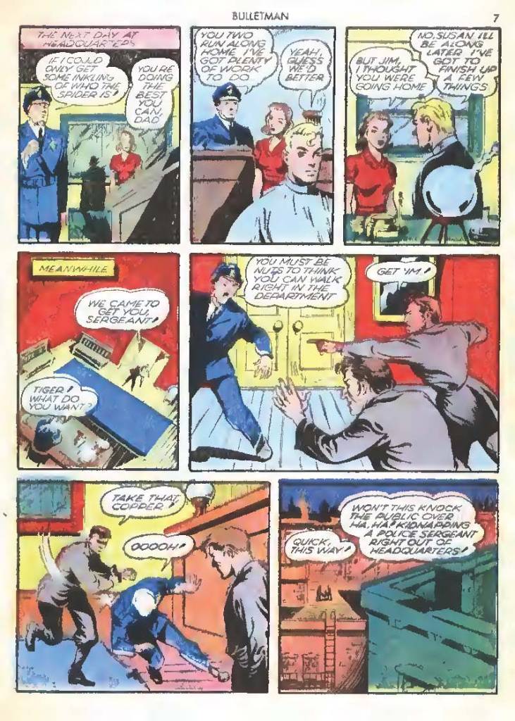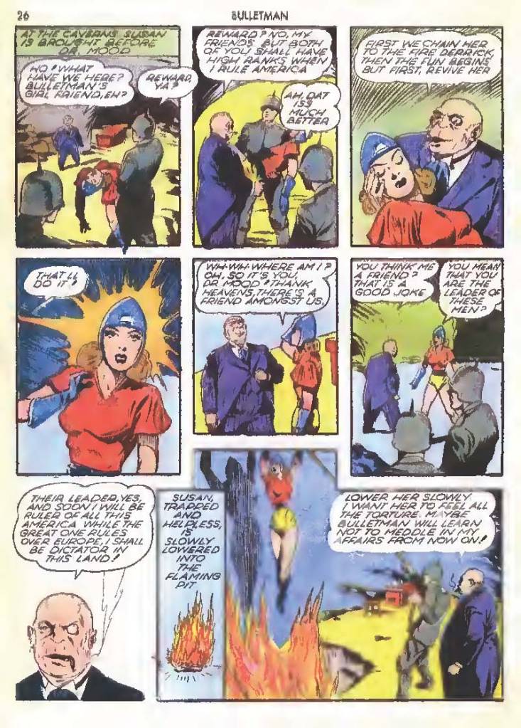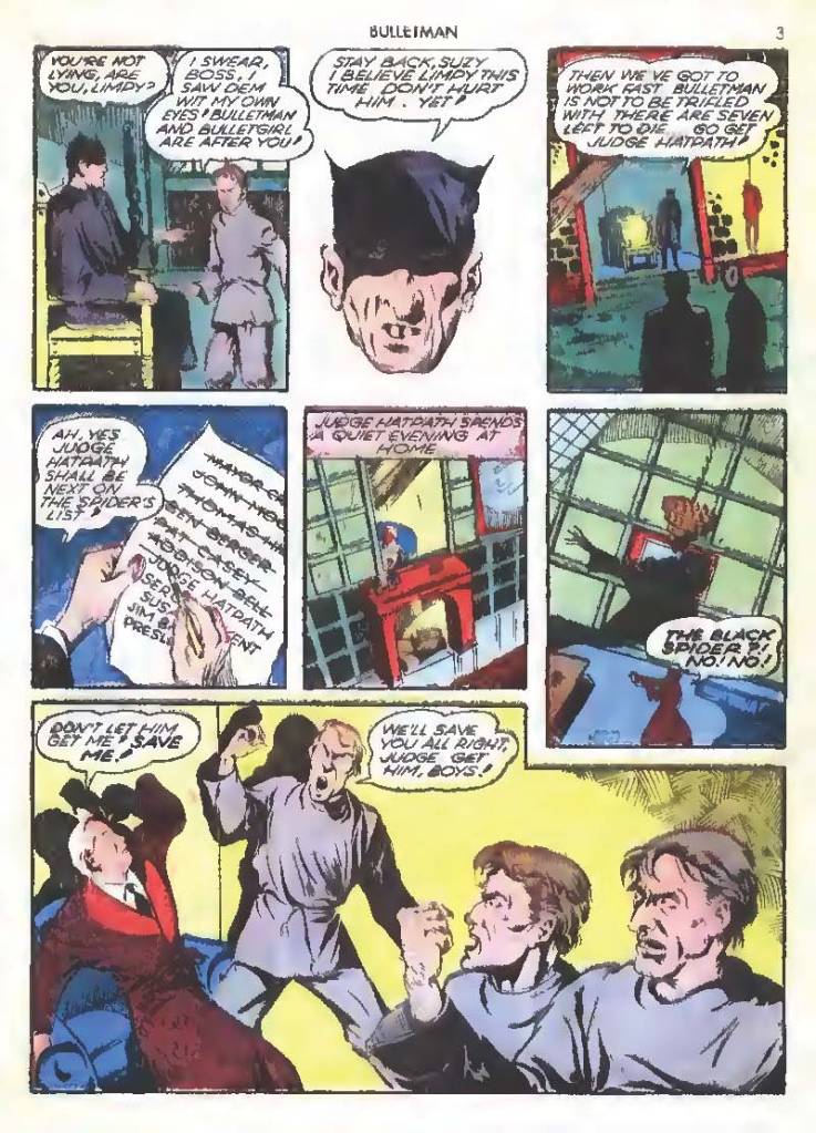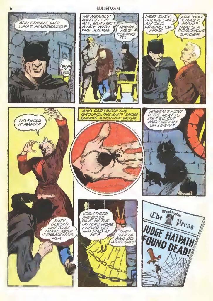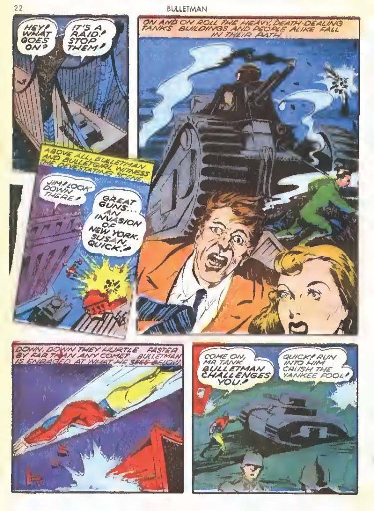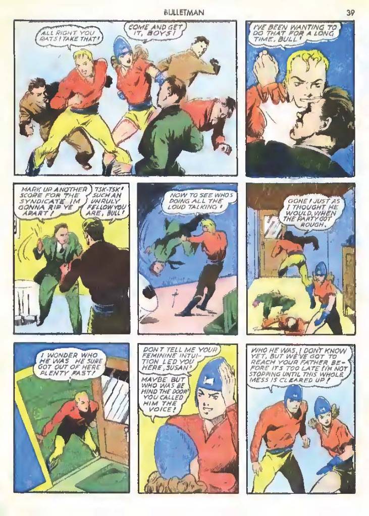 Shortly after Bulletman began his crime-fighting career, he created a second helmet for his girlfriend and later wife Susan Kent, daughter of Police Sergeant Kent who adopted the name Bulletgirl. His formula was shown to make him strong enough to smash a tank.