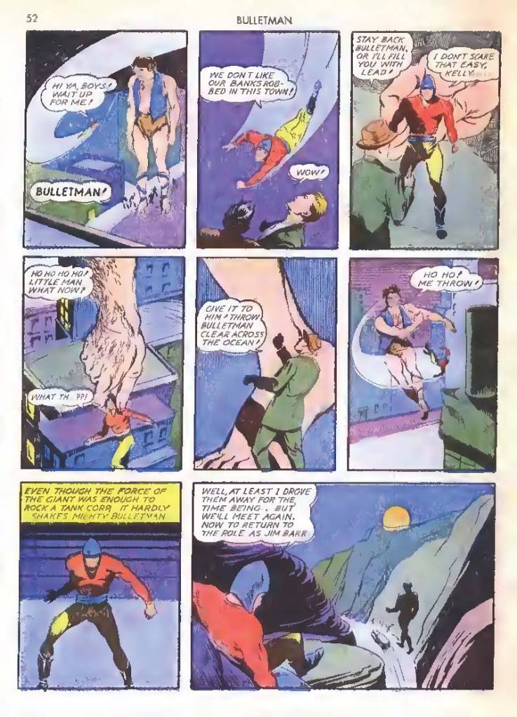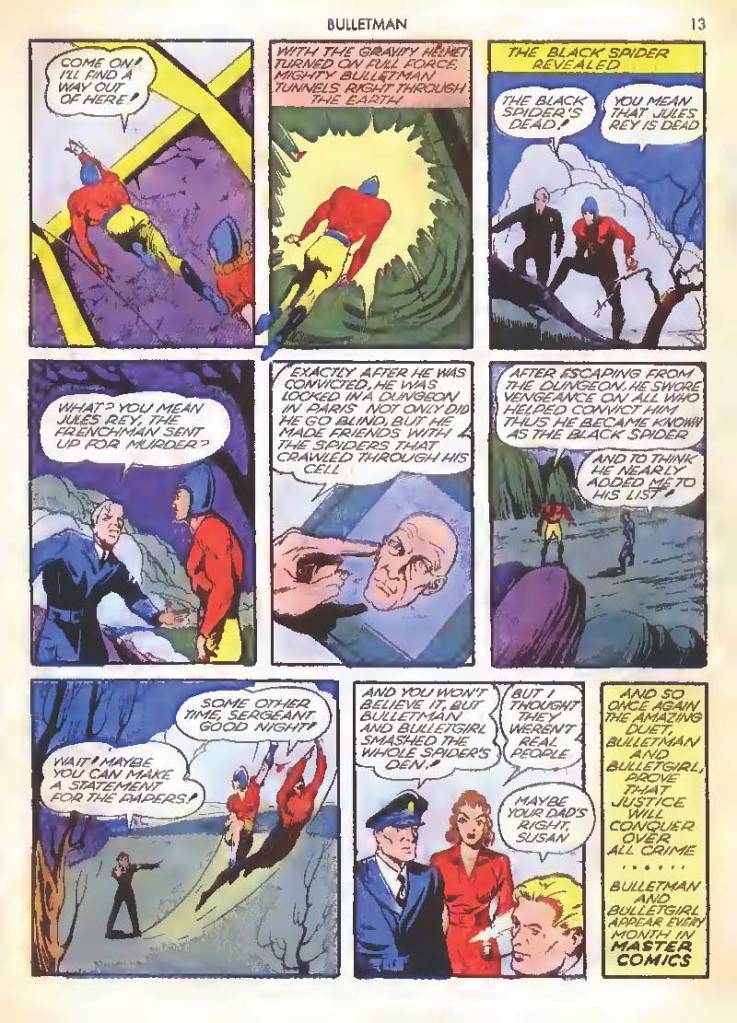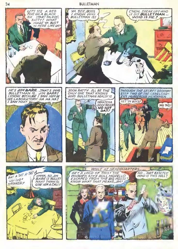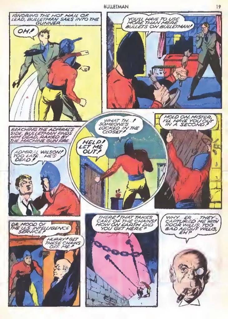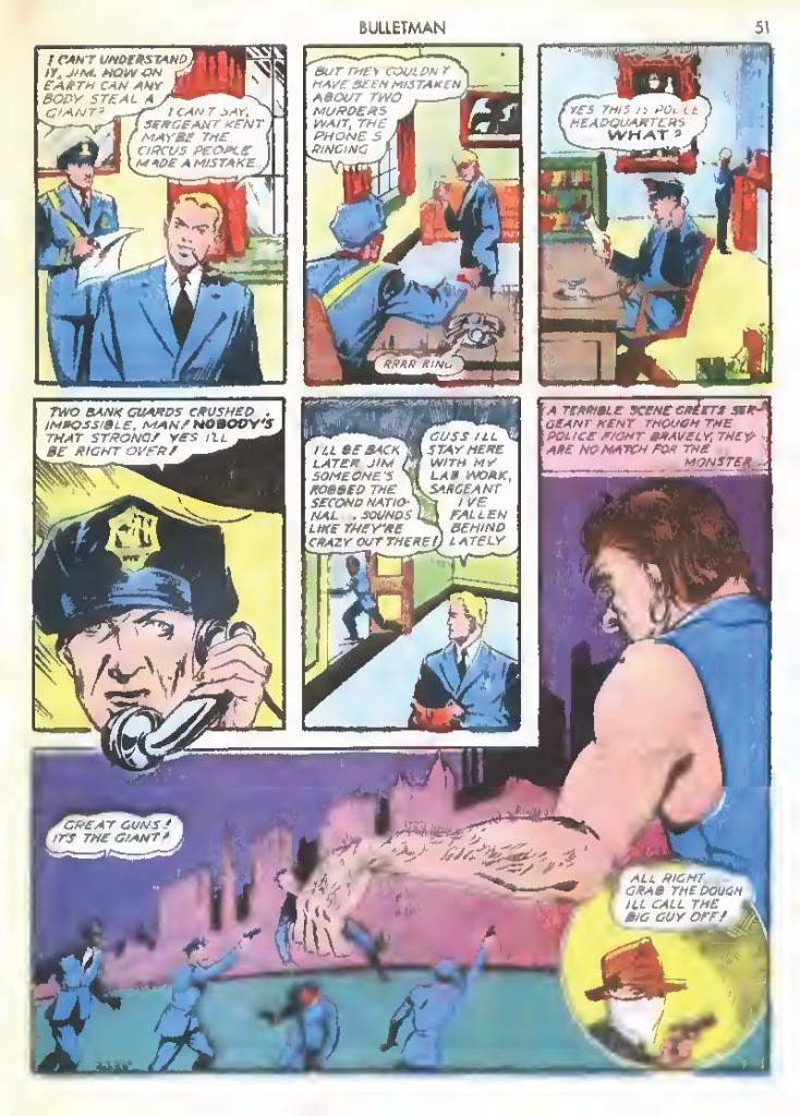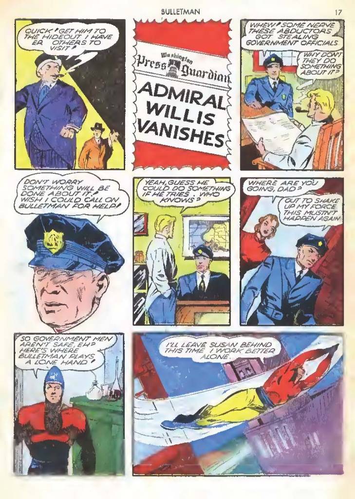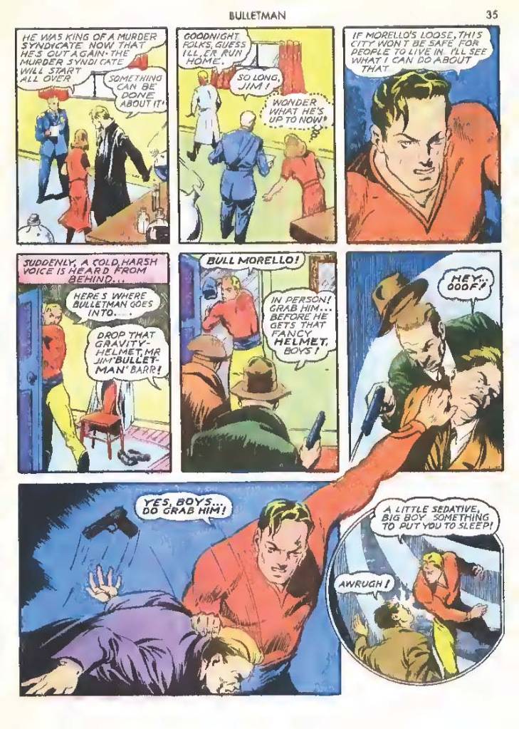 Like many characters of the time, he used chemistry to develop powers for himself, in his case greater muscle mass and brain power using his “crime cure.” He also invented a bullet-shaped Gravity Regulator Helmet which allowed him to fly and deflect bullets. His first case involved capturing a gangster in his hideout.