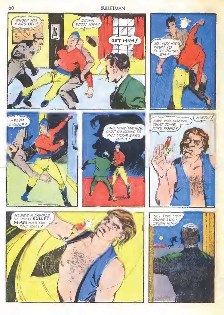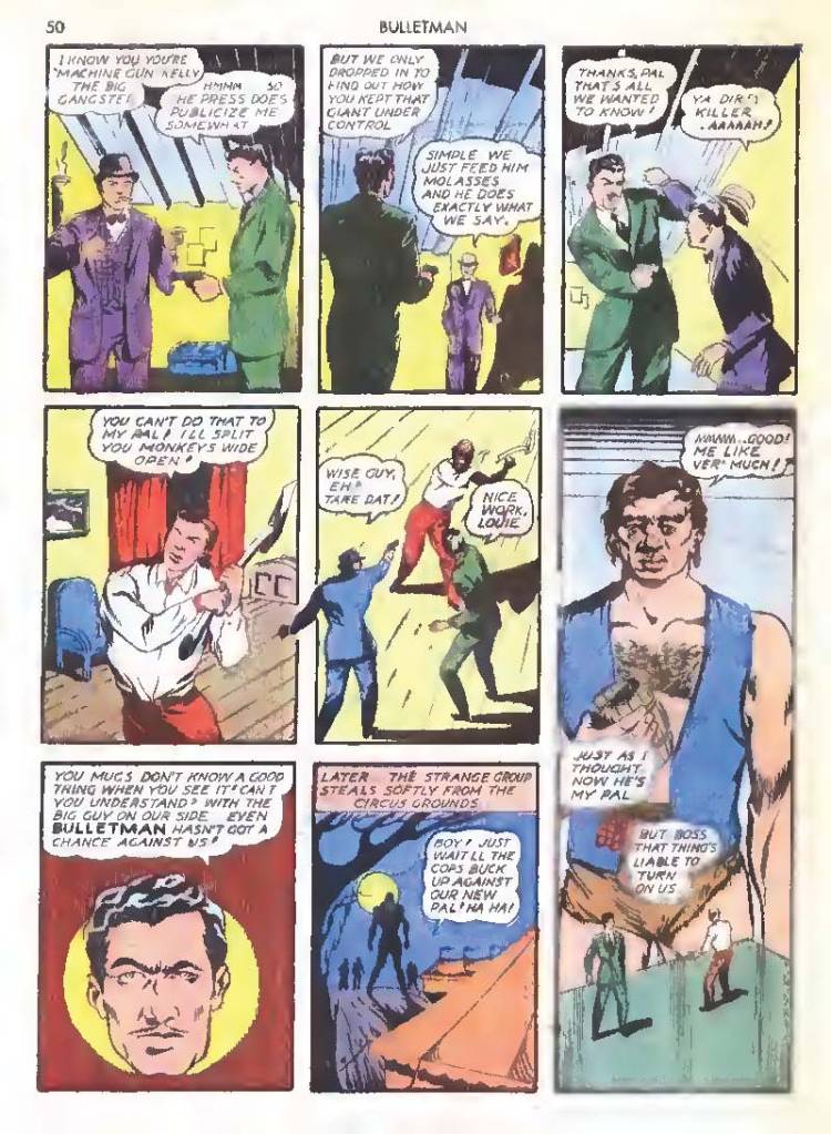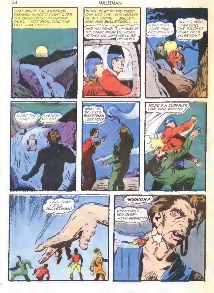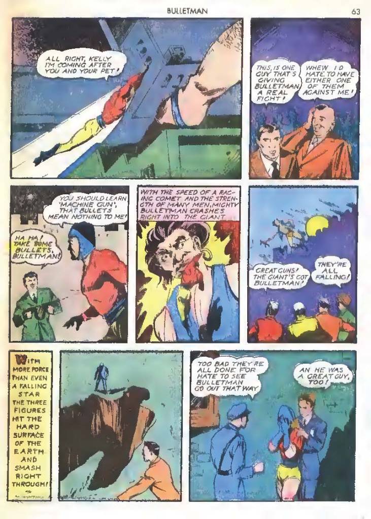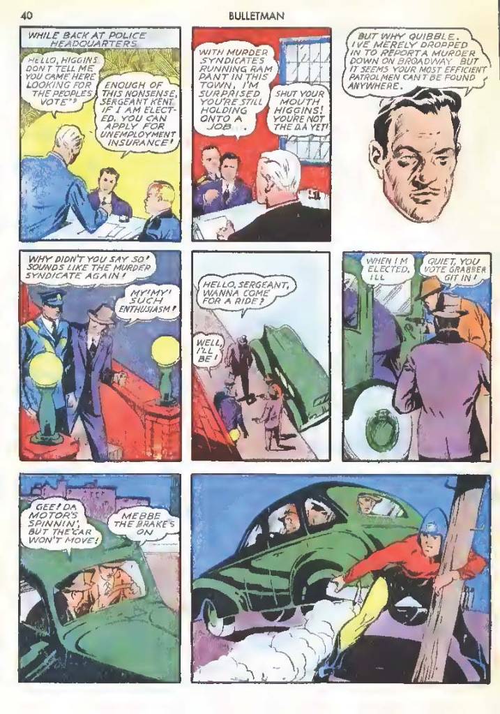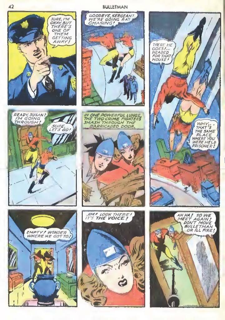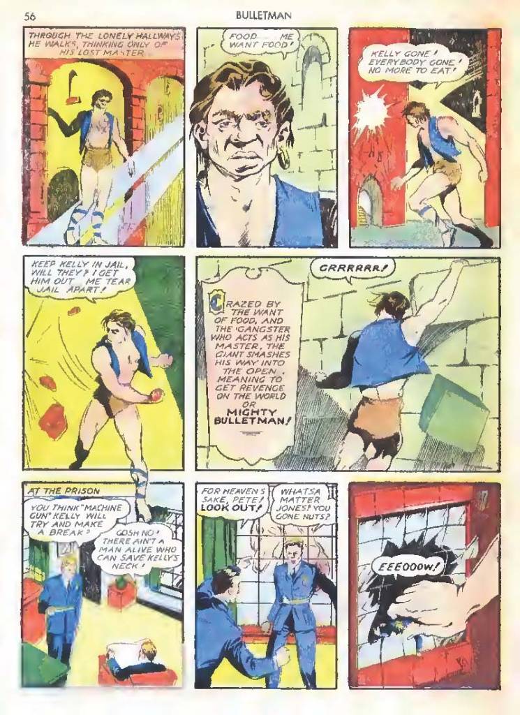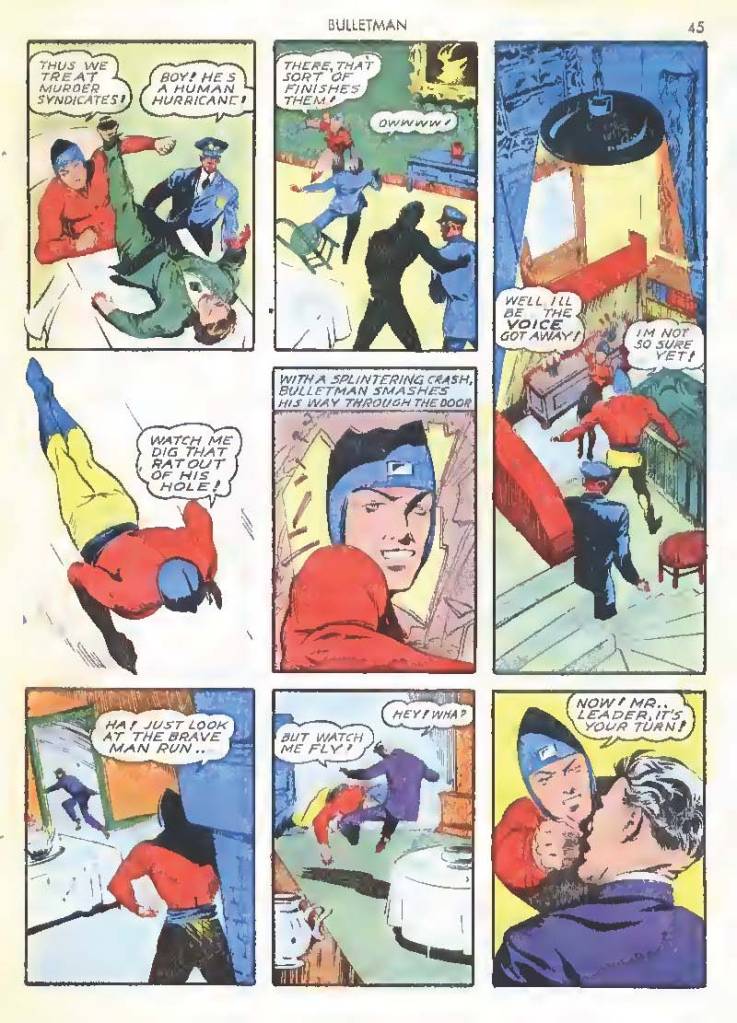 Like many characters of the time, he used chemistry to develop powers for himself, in his case greater muscle mass and brain power using his “crime cure.” He also invented a bullet-shaped Gravity Regulator Helmet which allowed him to fly and deflect bullets. His first case involved capturing a gangster in his hideout.