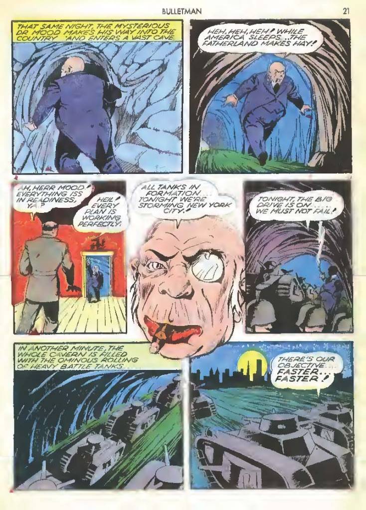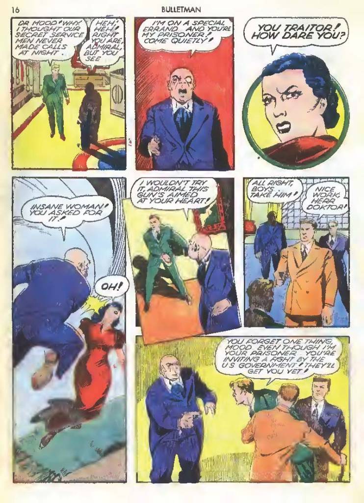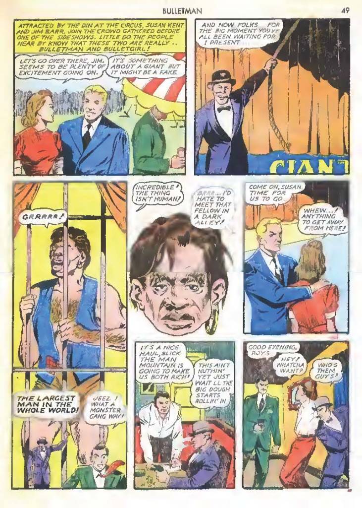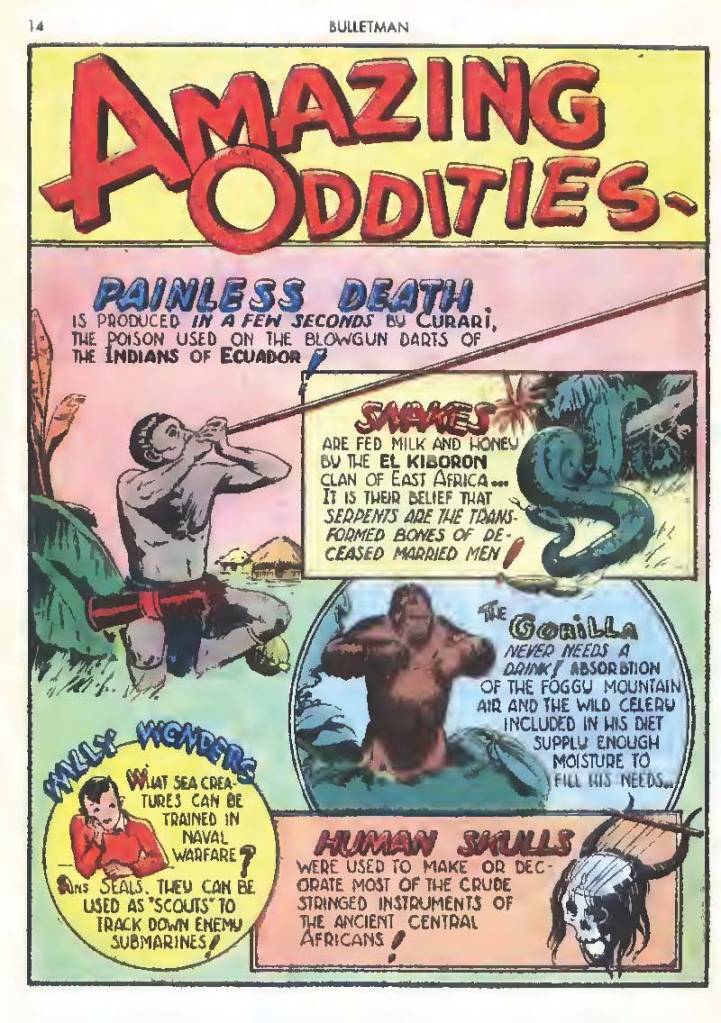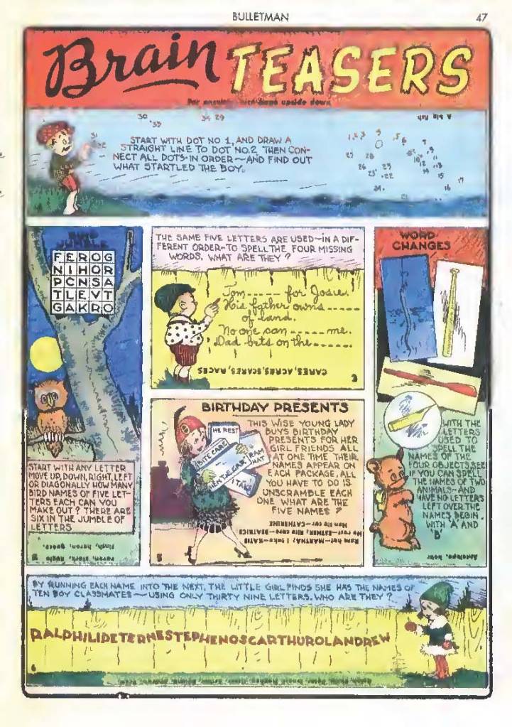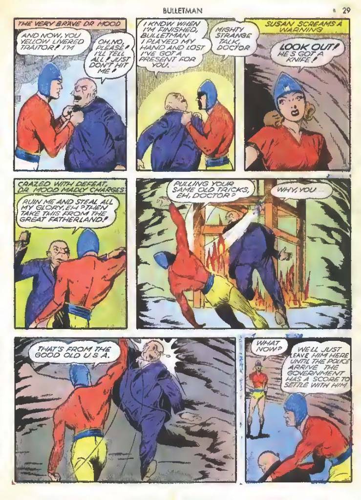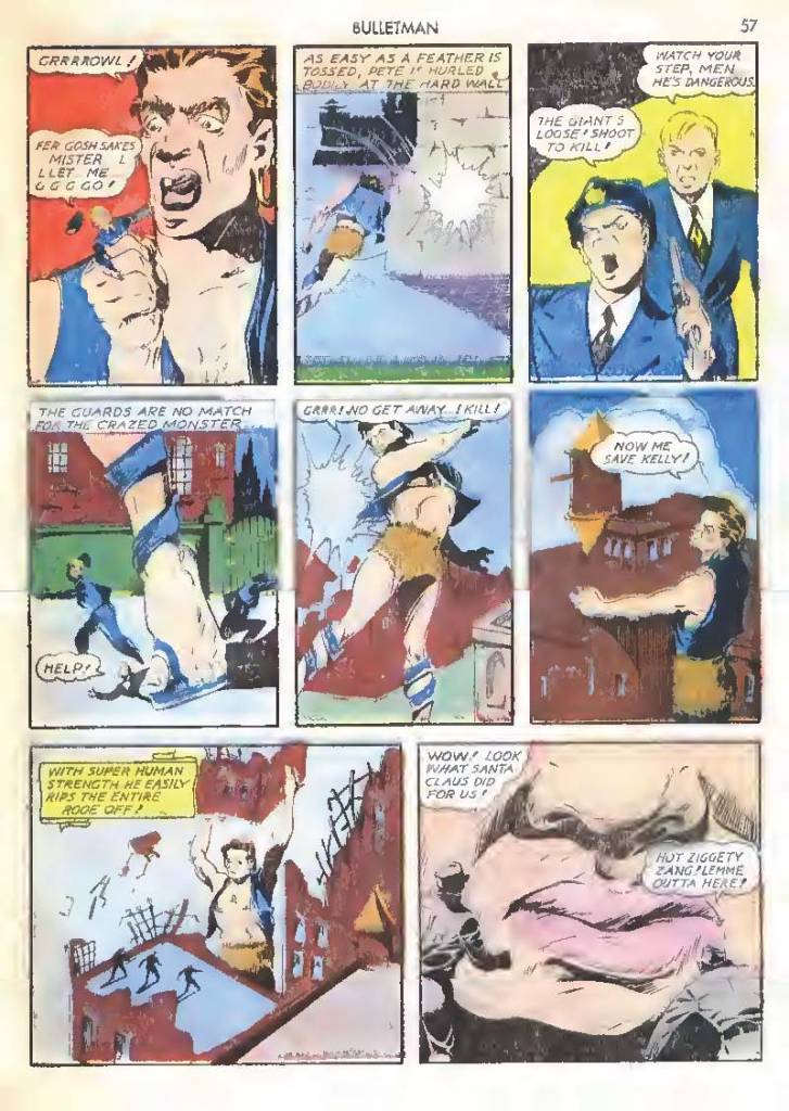 Like many characters of the time, he used chemistry to develop powers for himself, in his case greater muscle mass and brain power using his “crime cure.” He also invented a bullet-shaped Gravity Regulator Helmet which allowed him to fly and deflect bullets. His first case involved capturing a gangster in his hideout.