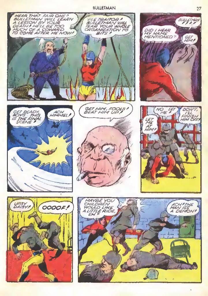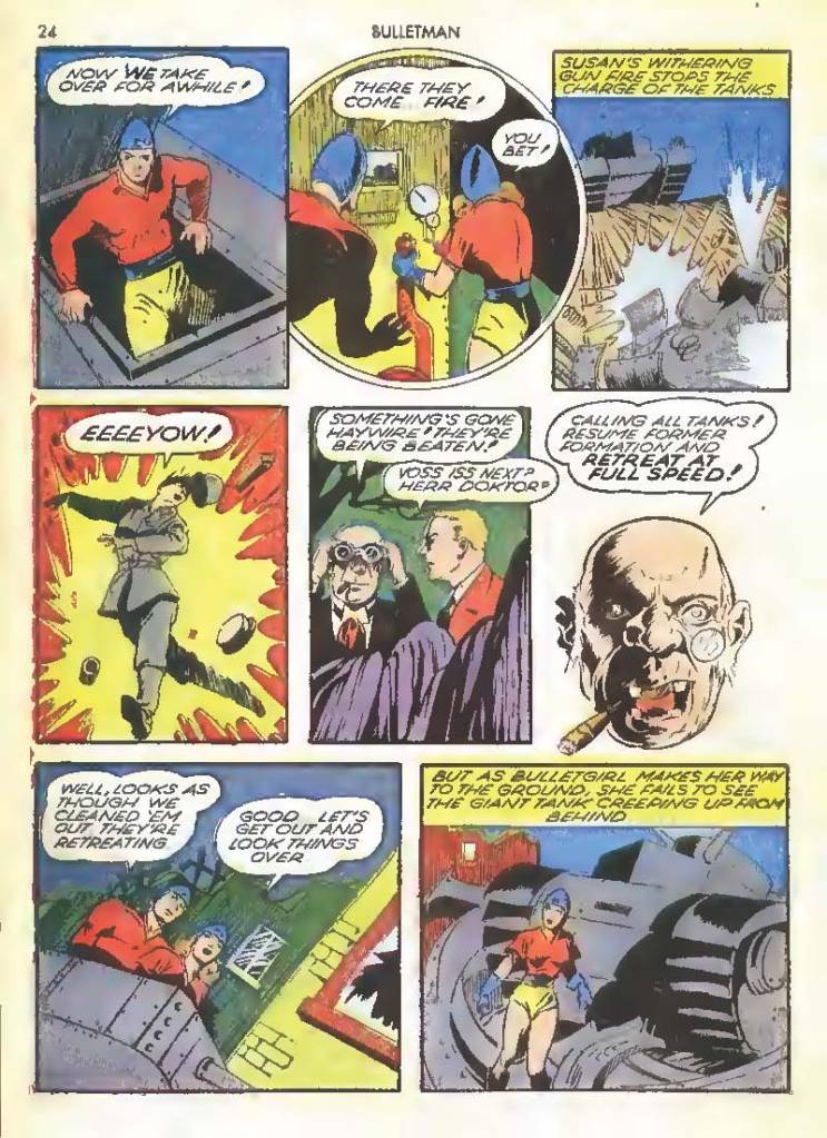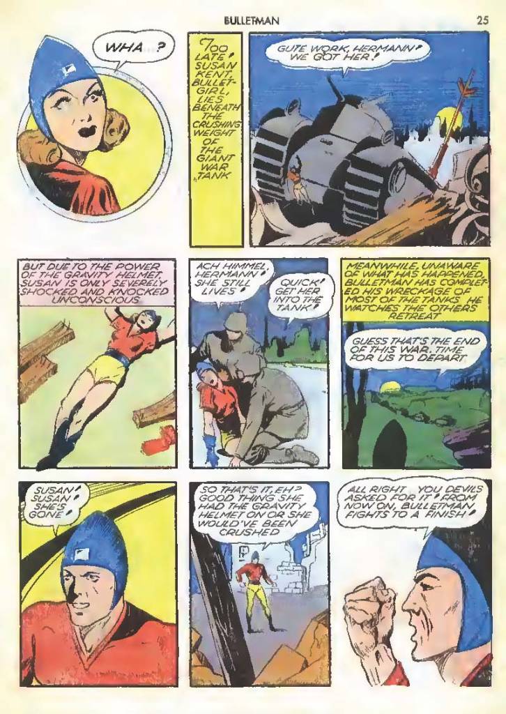 In addition to being bullet-shaped, their helmets also make the characters bulletproof. The helmet is shown to be so strong that once when Bulletgirl was run over by a Nazi tank she was only knocked out.