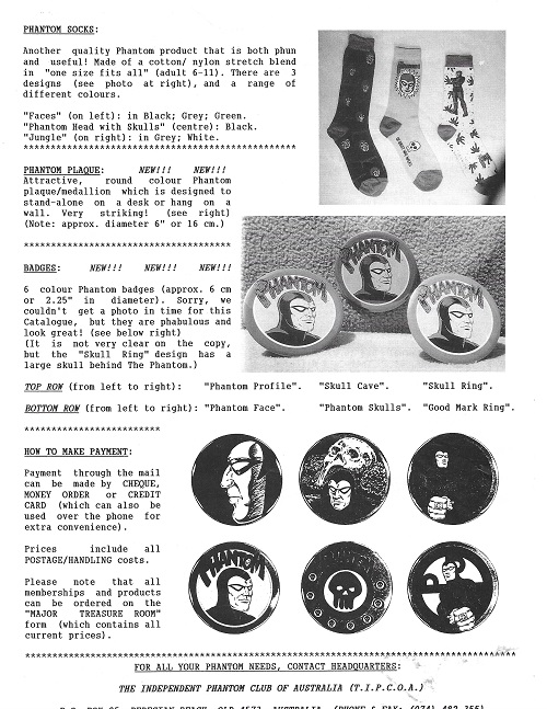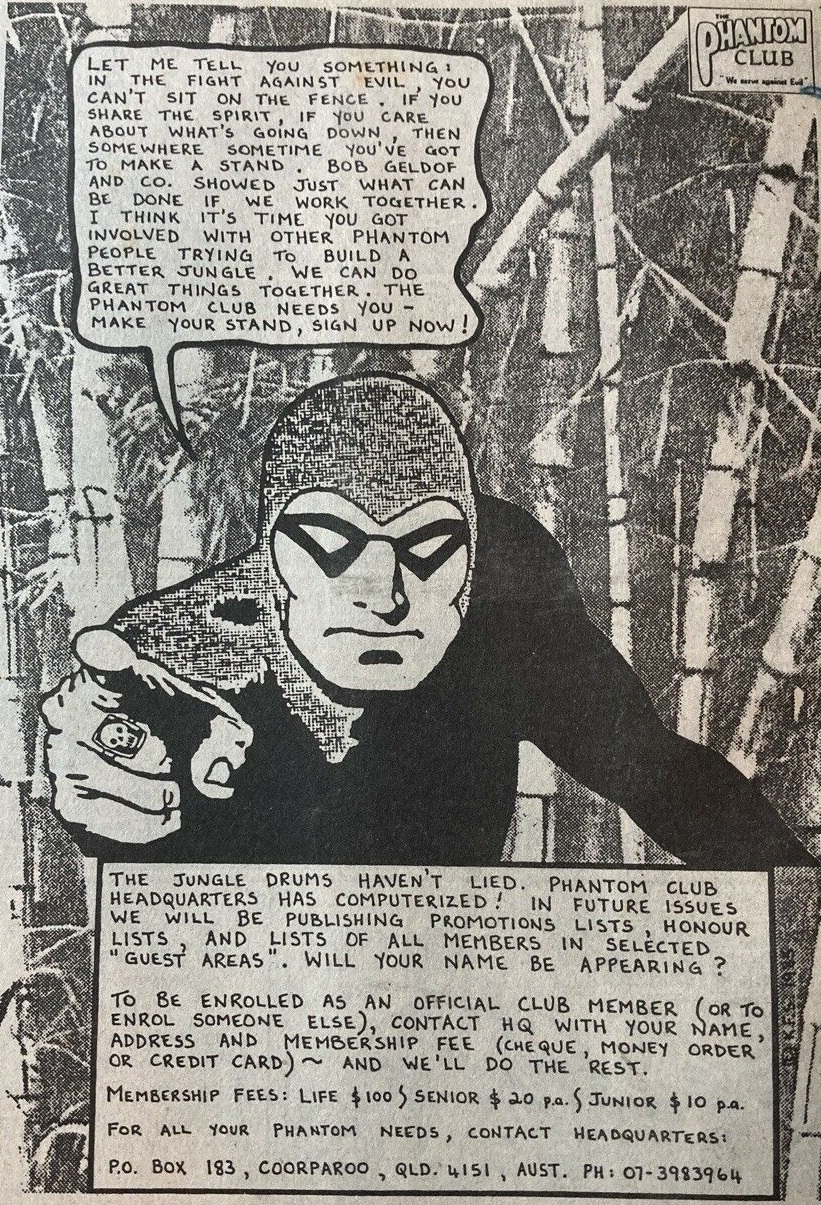 The club advertised heavily on the back of Frew Phantom comics. We see the first Fan Club advertisement appear on the back cover of Frew Phantom comic issue number 736, 1981.