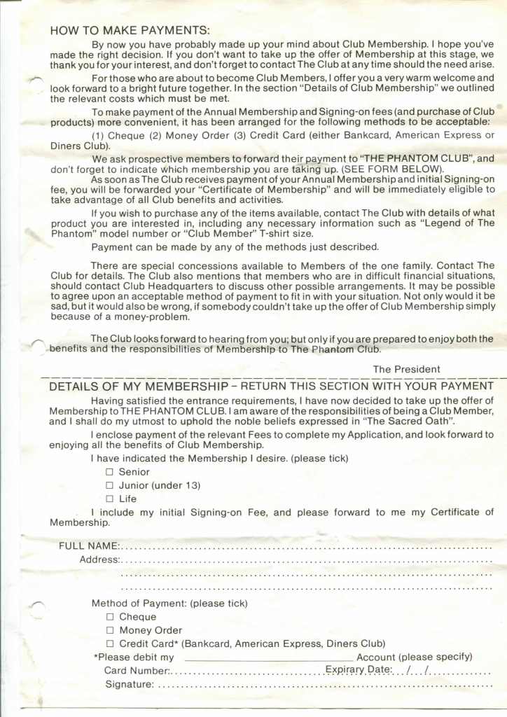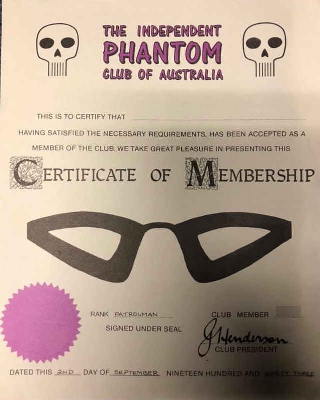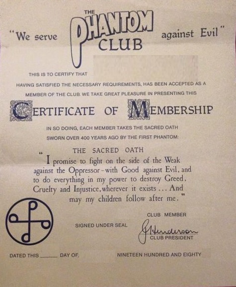 Club members were also issued with a ‘Certificate of Membership’ once the membership fee was paid, with each member appointed a club member number and rank. See below membership advertisement on the back of Frew Phantom comic number 834, and the 2 versions of the certificate issued (depending on the year of issue).