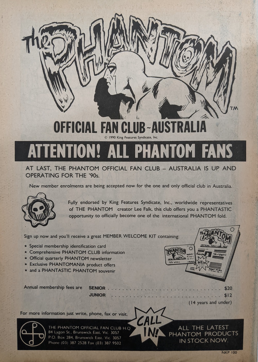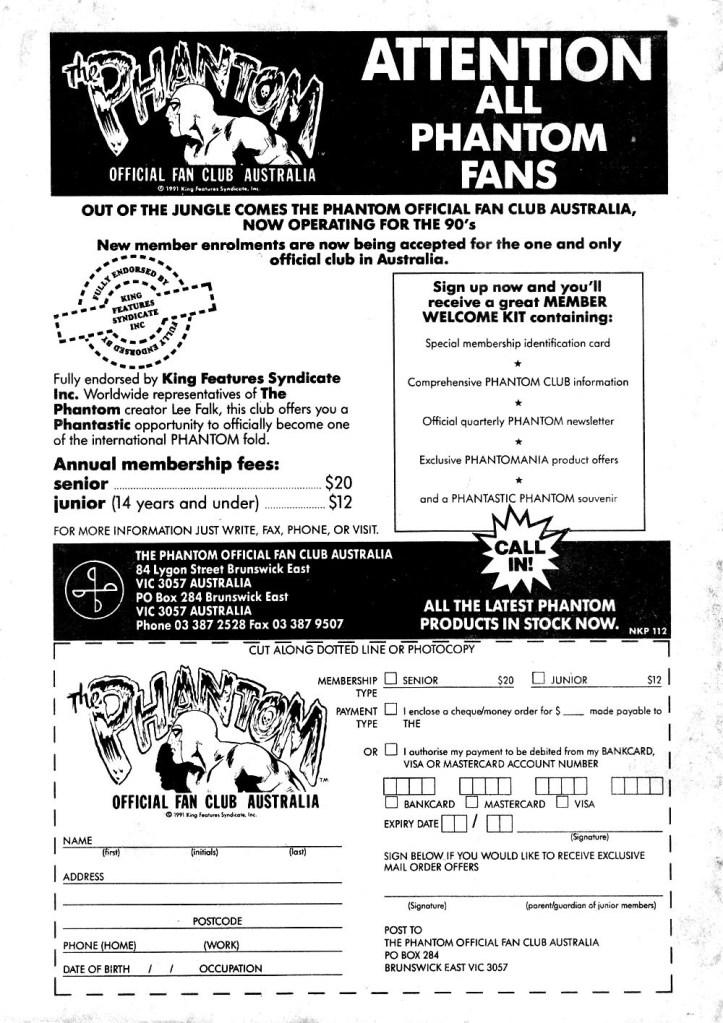 The Phantom Official Fan Club Australia was established in 1991 in Victoria, Australia. It was founded by Neville Kent, Aaron Littlejohn and Anthony Poloso and ran for 8 years, ending in 1998.