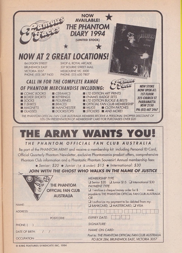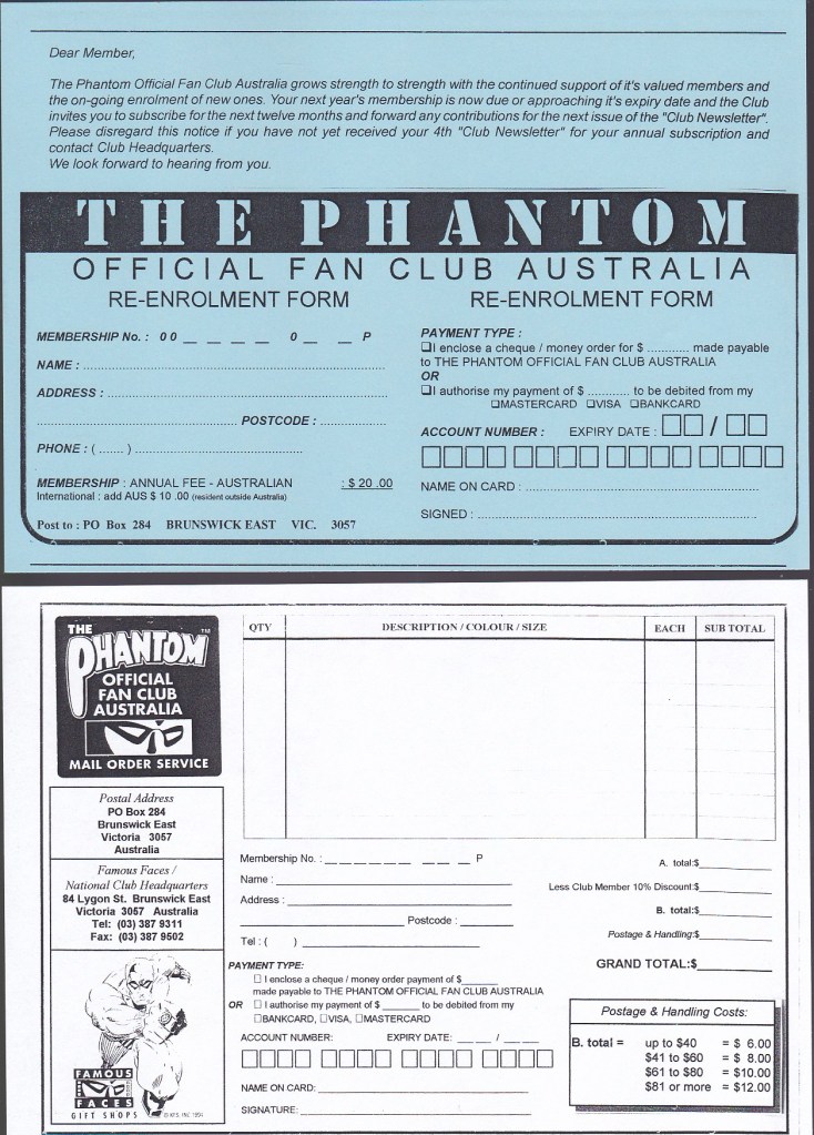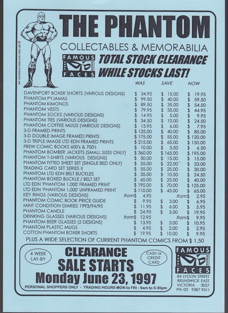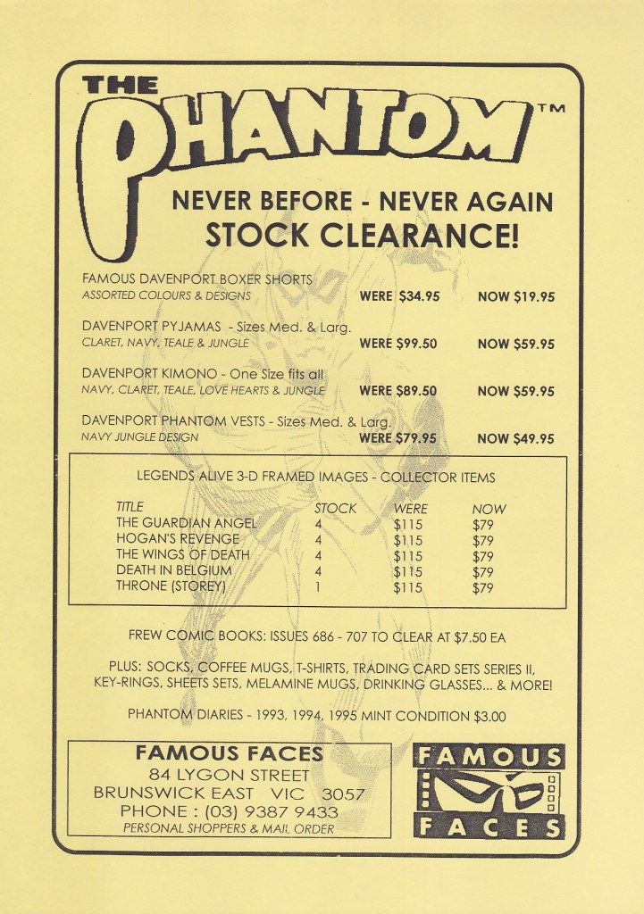 Various flyers to purchase Phantom merchandise were mailed to members with newsletters, available for purchase from ‘Famous Faces Gifts Shop’, who ran 3 stores throughout Melbourne, Victoria, Australia at the time. A small sample of these flyers can be seen below.