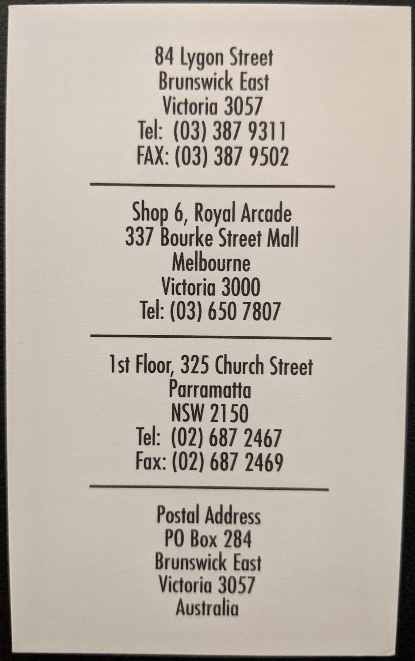 The Famous Faces Gifts Shop’s locations can be seen on the below business card. Headquarters to the club are reported as being based out of the Brunswick East store.