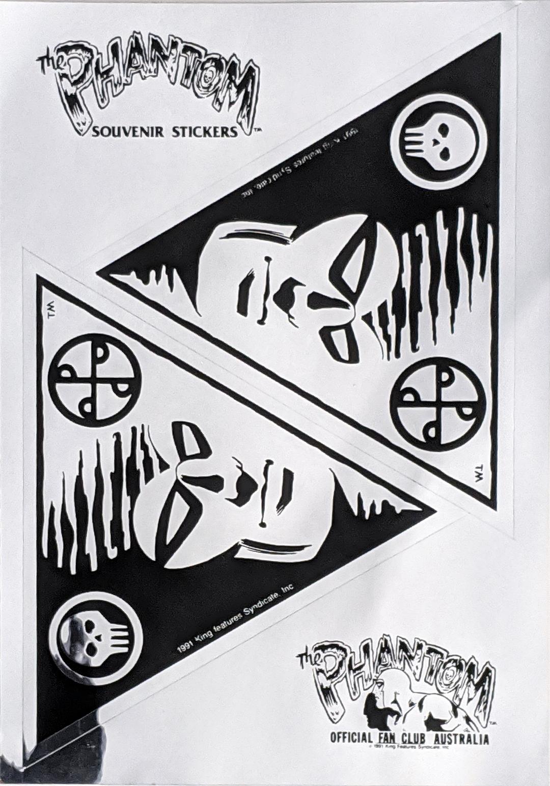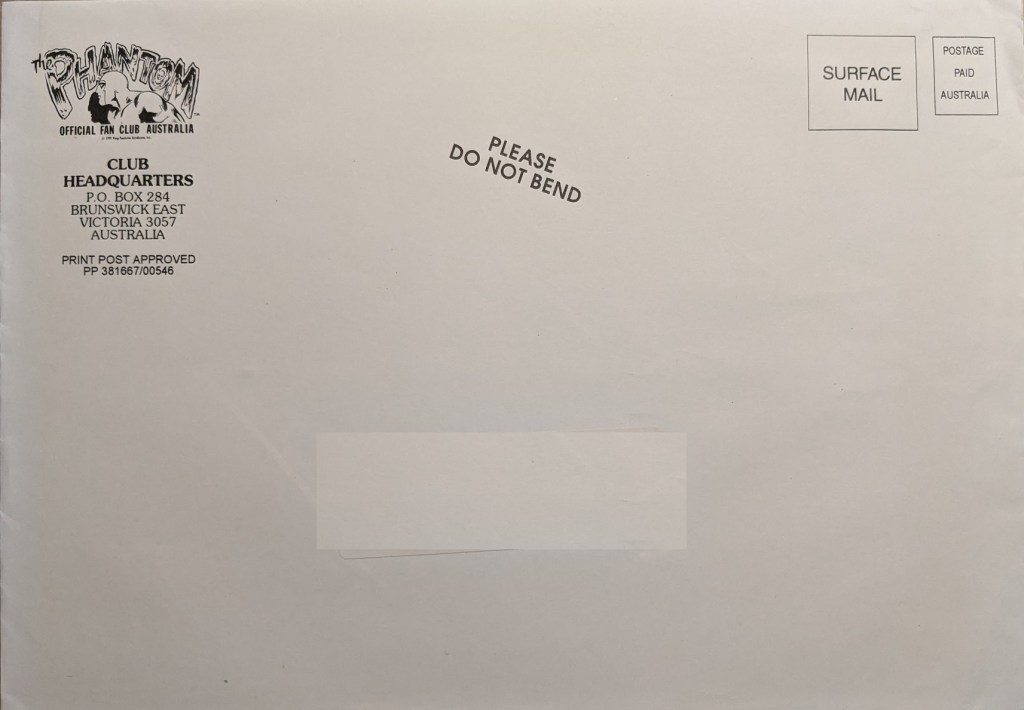 The Phantom Official Fan Club Australia introductory pack came in the form of a white gloss manila folder, with the clubs logo on the front and included a pair of highly reflective foil souvenir stickers. Two designs of the folder were used by the club.
