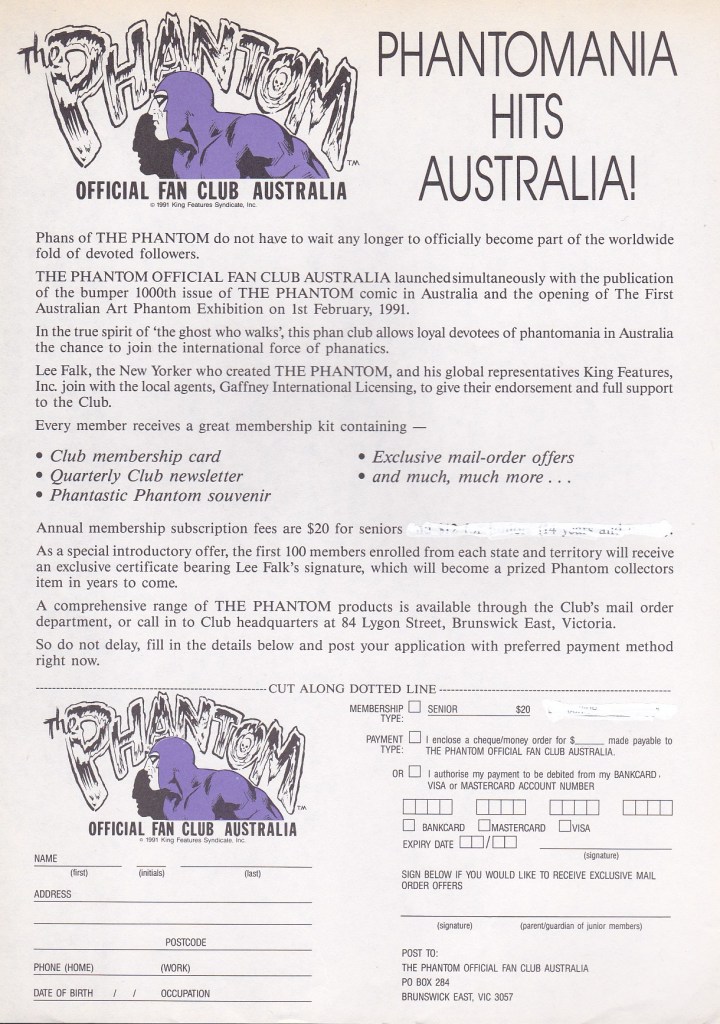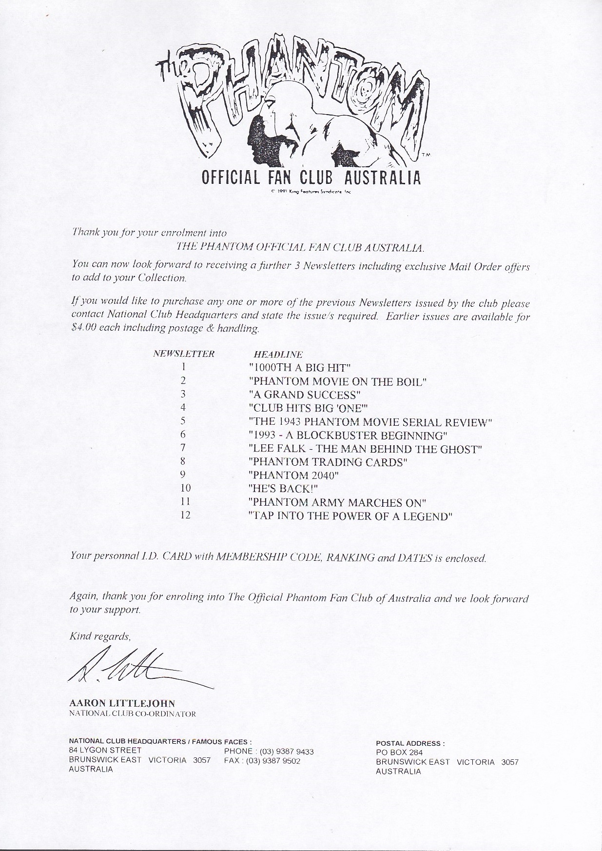 The Phantom Official Fan Club Australia was authorized by King Features Syndicate with all paraphernalia the club issued being Trade Marked. The introductory pack received upon becoming a member even contained a welcome message from Lee Falk.