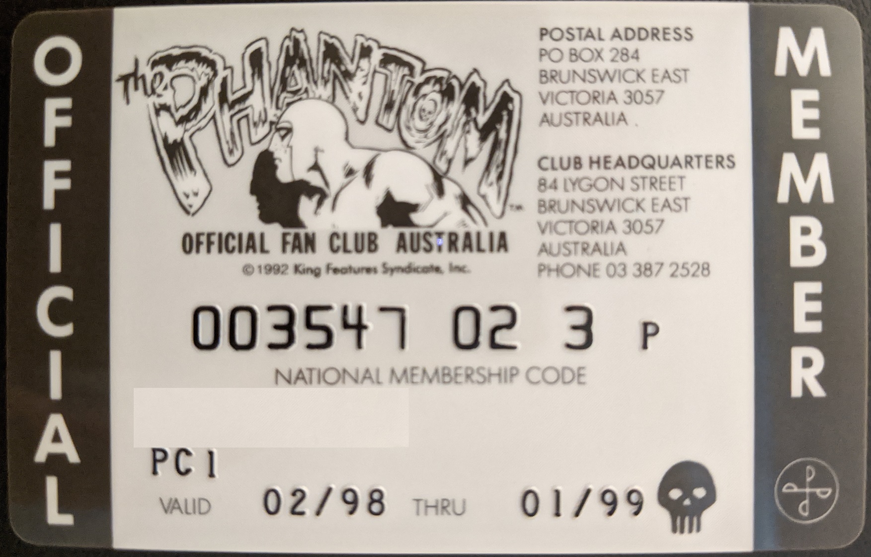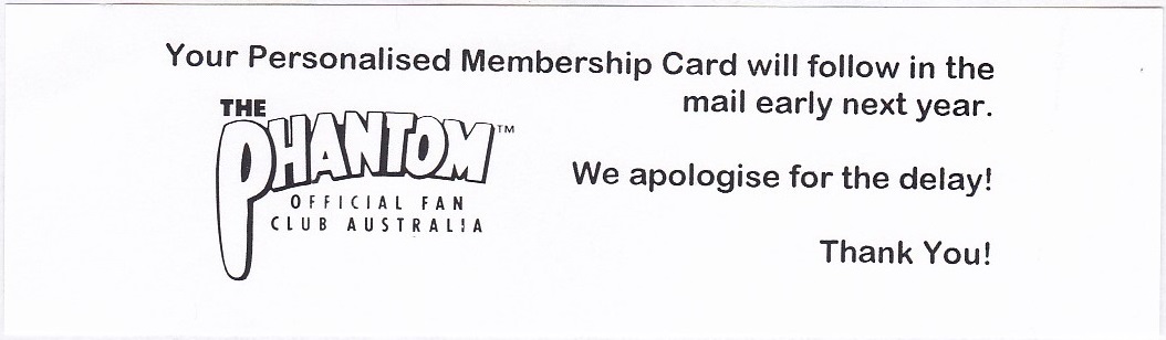 Being part of The Phantom Official Fan Club Australia also meant that you received a yearly membership card with your name and rank on it, as long as membership was paid on a yearly basis. These cards sometimes arrived late, with a courteous message sent with newsletters notifying members of same.
