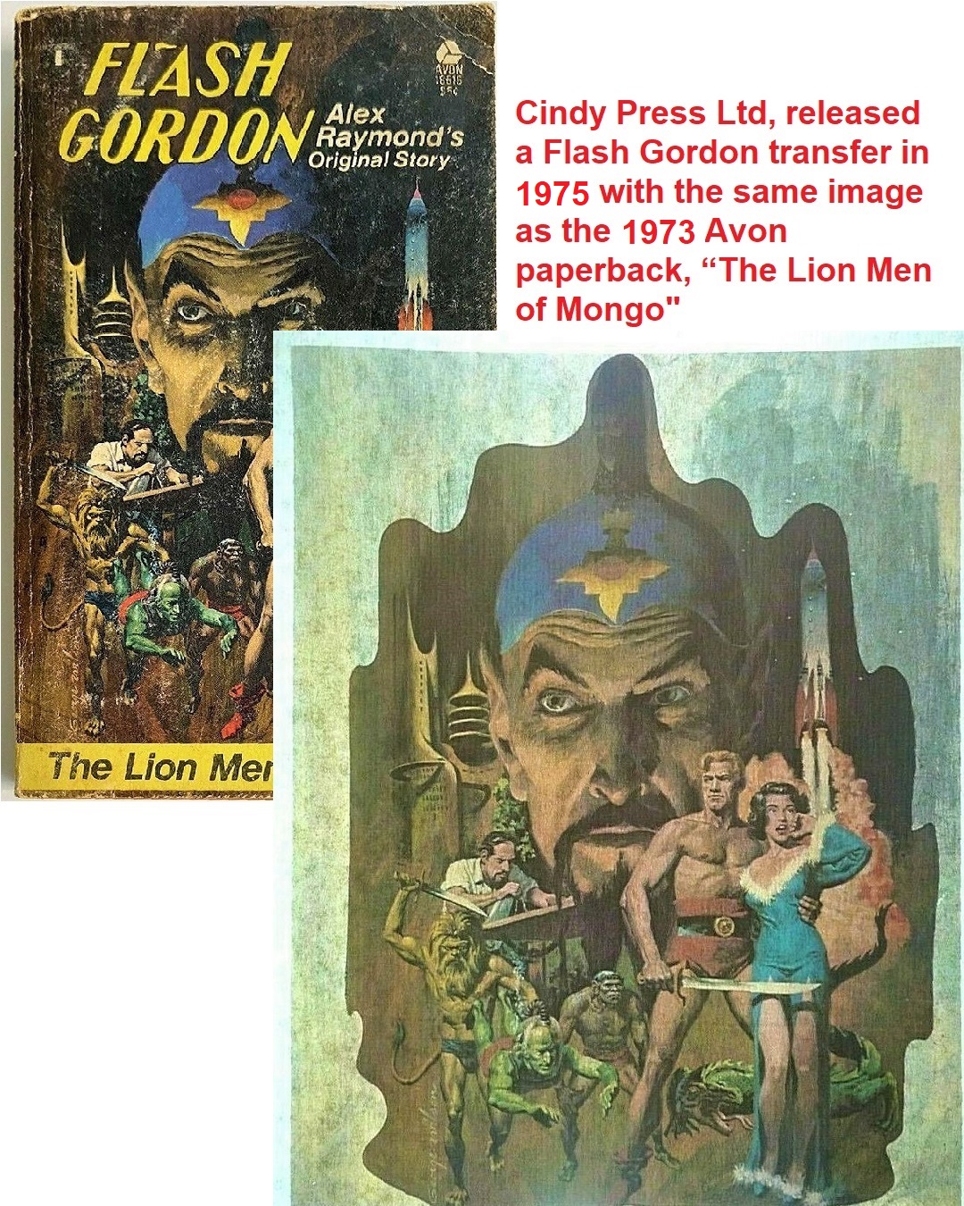 ‘Cindy Press Ltd’ also released a Flash Gordon transfer in 1975/76 with the same image (by Alex Raymond) as that found on the 1973 Avon paperback cover, ‘The Lion Men of Mongo’.